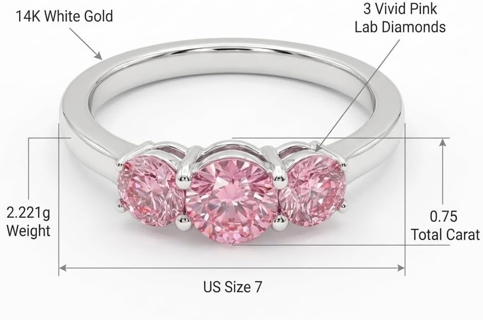 This elegant three-stone ring showcases a beautiful pink lab-grown diamond design set in 14K white gold. The center round cut pink diamond is complemented by two matching side stones, creating a balanced and luxurious look. With a total diamond weight of 0.75 carat and VVS clarity, the ring offers exceptional brilliance and sparkle. Lab-grown diamonds are real diamonds created using advanced technology and are chemically identical to natural diamonds, offering excellent beauty at a better value. The ring weighs approximately 2.221 grams of 14K white gold and comes in size 7, making it perfect as an engagement ring, anniversary gift, or special jewelry piece. ๐ Search Terms (Backend Keywords) pink diamond ring lab grown diamond ring 0.75 carat diamond ring three stone diamond ring 14k white gold ring engagement ring for women pink diamond engagement ring vvs diamond ring