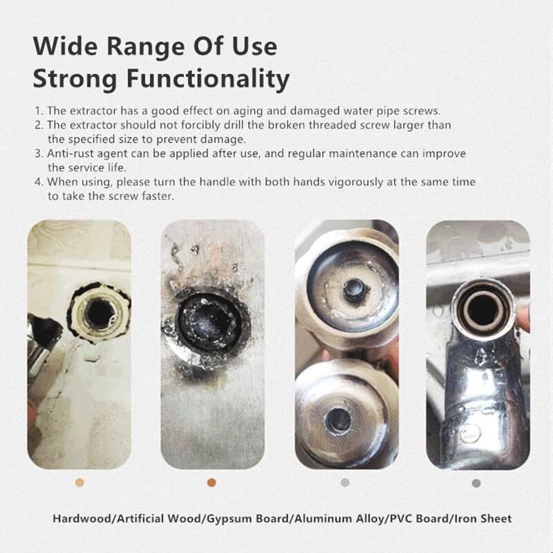 Description: - 100% brand new and high quality - Made of high quality material, durable and practical to use - Used to remove damaged, rusted or peeling screws, bolts, fasteners. - Made of high-quality materials, strong claw force. - Suitable for large diameter pipes such as 1/2 inch and 3/4 inch. - Versatile, also suitable for ordinary screw removal. - It can be used to remove and clean broken wires in pipeline maintenance. Specifications: Material: Carbon Steel Colour: Black Size: 1/2 ", 3/4"(Approx.) Suitable: Hardwood/Artificial Wood/Gypsum Board/Aluminum Alloy/PVC Board/Iron Package Included: 1 Set of Pipe Damaged Screw Extractors packing :1pc