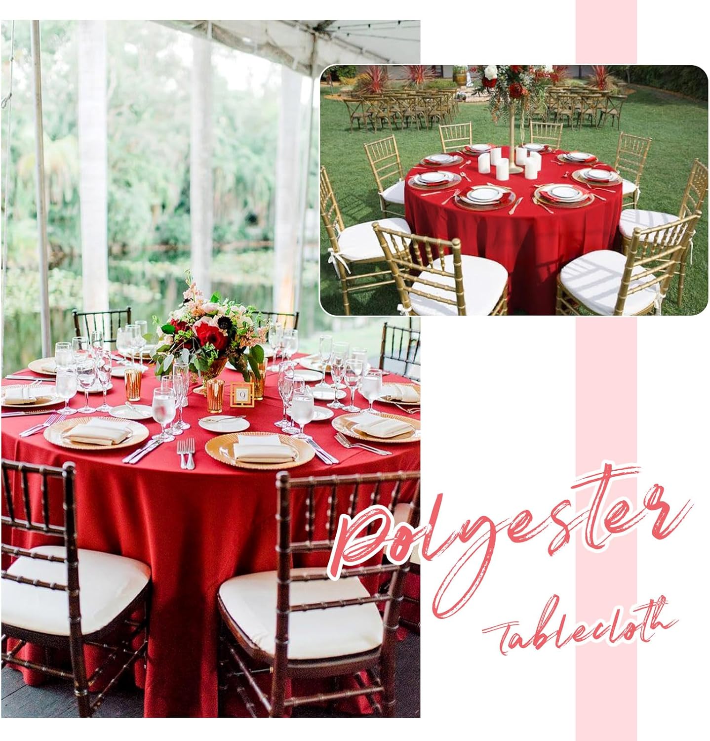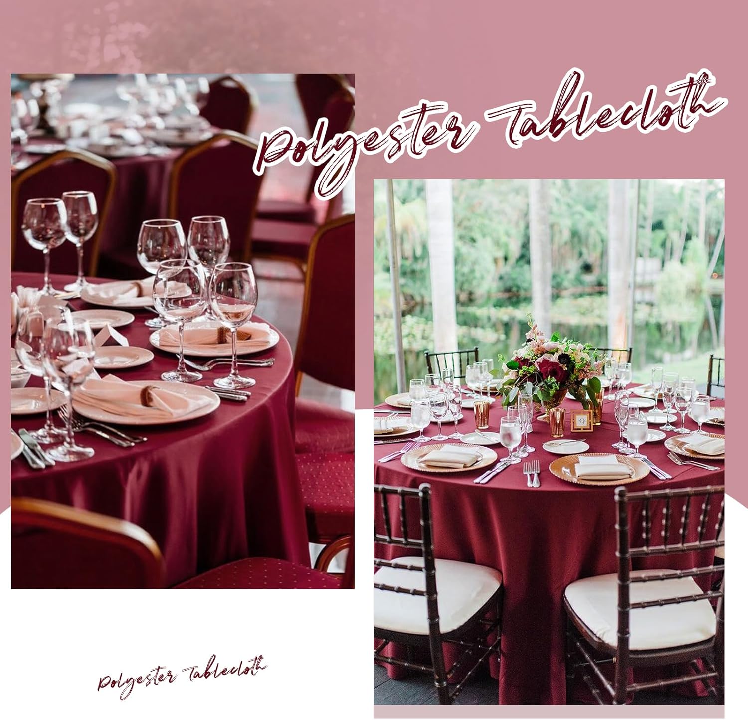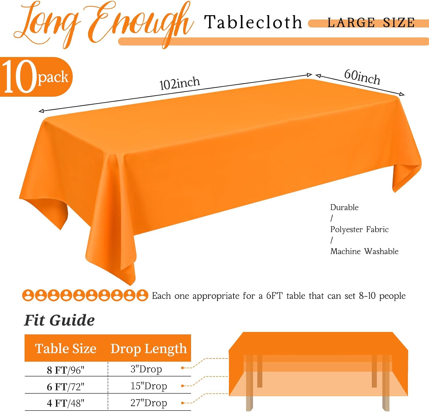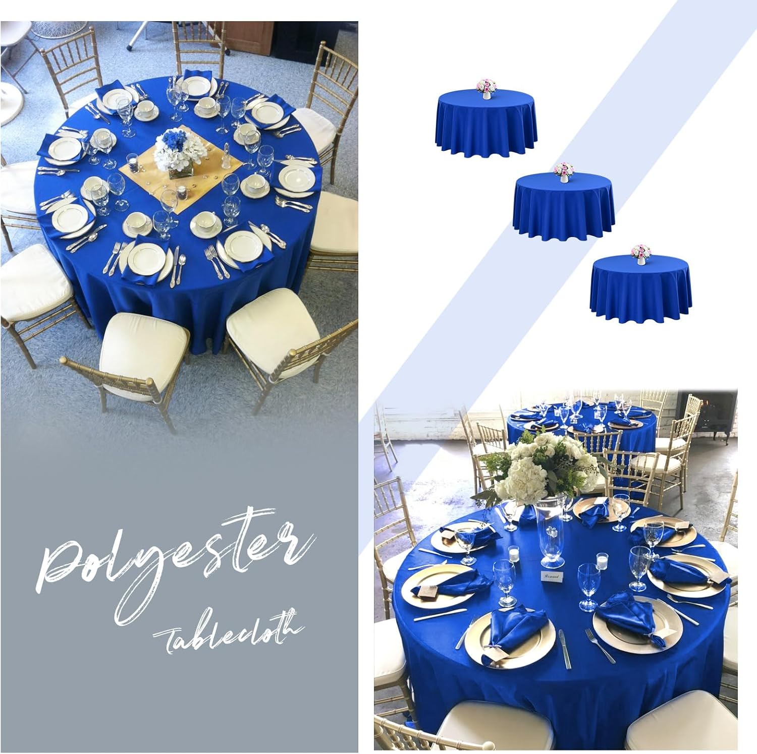 12 Pack 90" Round Polyester TableclothsQuantity: 6 packs, 10 packsMaterial: 100% Premium Polyester FabricSize: Round polyester tablecloths are available in: 60", 90", 108", 120"Rectangular polyester tablecloths are available in: 60" x 84", 60" x 102", 60" x 126", 90" x 132", 90" x 156"Square polyester tablecloths are available in: 52" x 52", 70" x 70", 85" x 85"Polyester Tablecloth Features:Classic solid color design with an elegant look, soft feel and beautifully stitched edges.It can be applied to all kinds of dining table furniture and provides good protection.Durable material, can be washed and reused many times, won't curl and tear after washing.Add an elegant touch to your event and your guests are sure to impress.Polyester tablecloths are suitable for various occasions:WeddingBridal ShowerBirthday PartyBanquetHotelCafeAlso works with various tables:Dining TableDessert Buffet tablePicnic TableReminder:1. In order to avoid buying the wrong size, please measure your table size before purchasing, and choose the tablecloth that suits you according to our size picture display.2. Manual measurement, there will be 1-2cm error, please understand.3. The computer screen and the mobile phone screen display different colors, and there will be color differences.