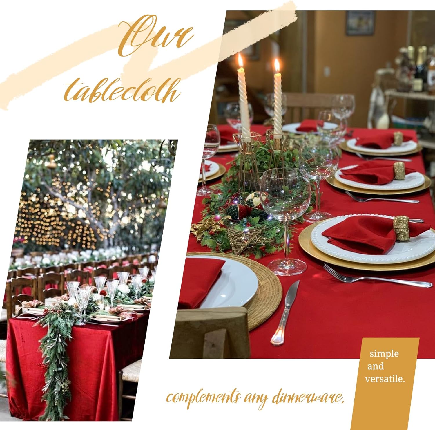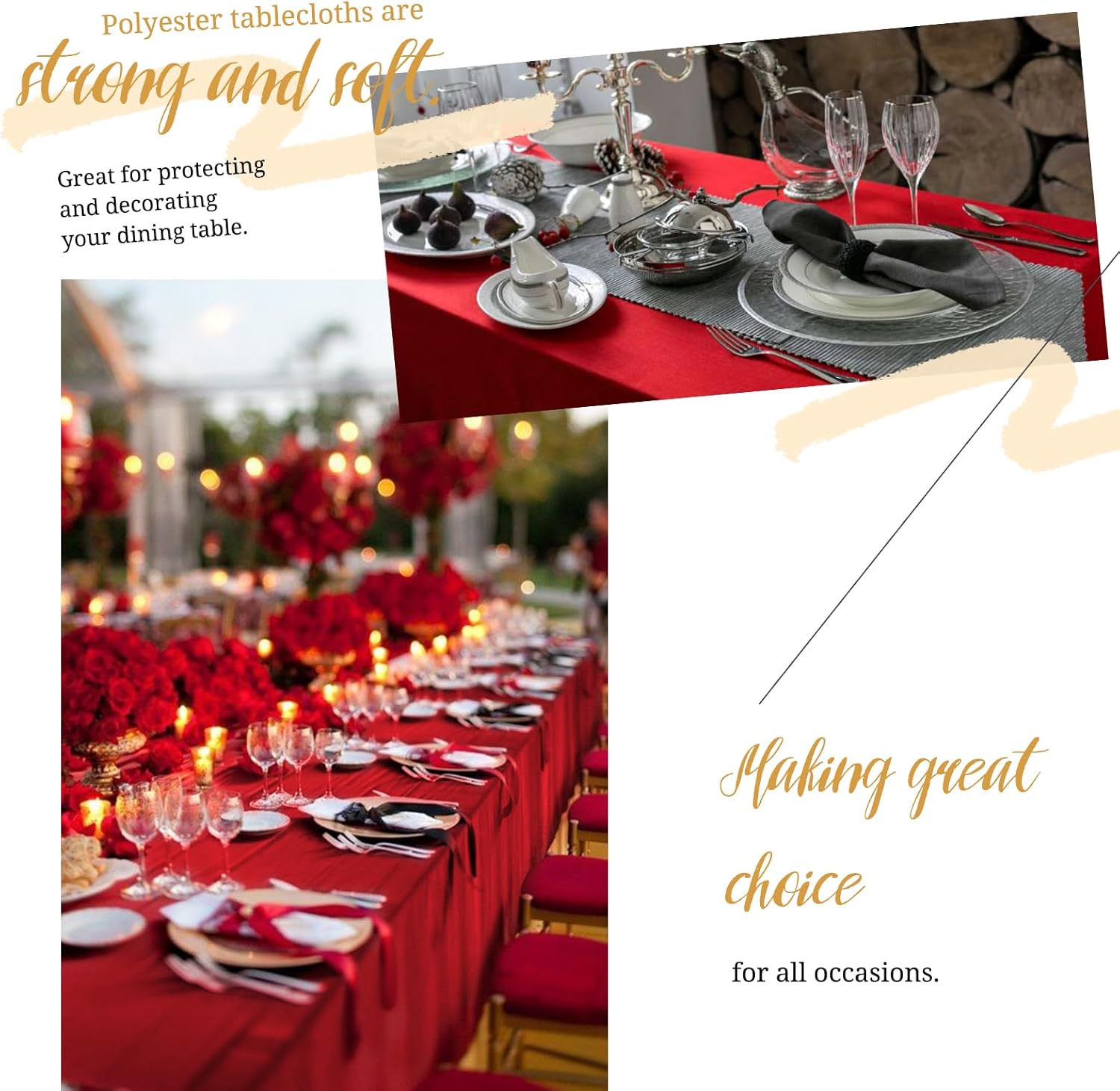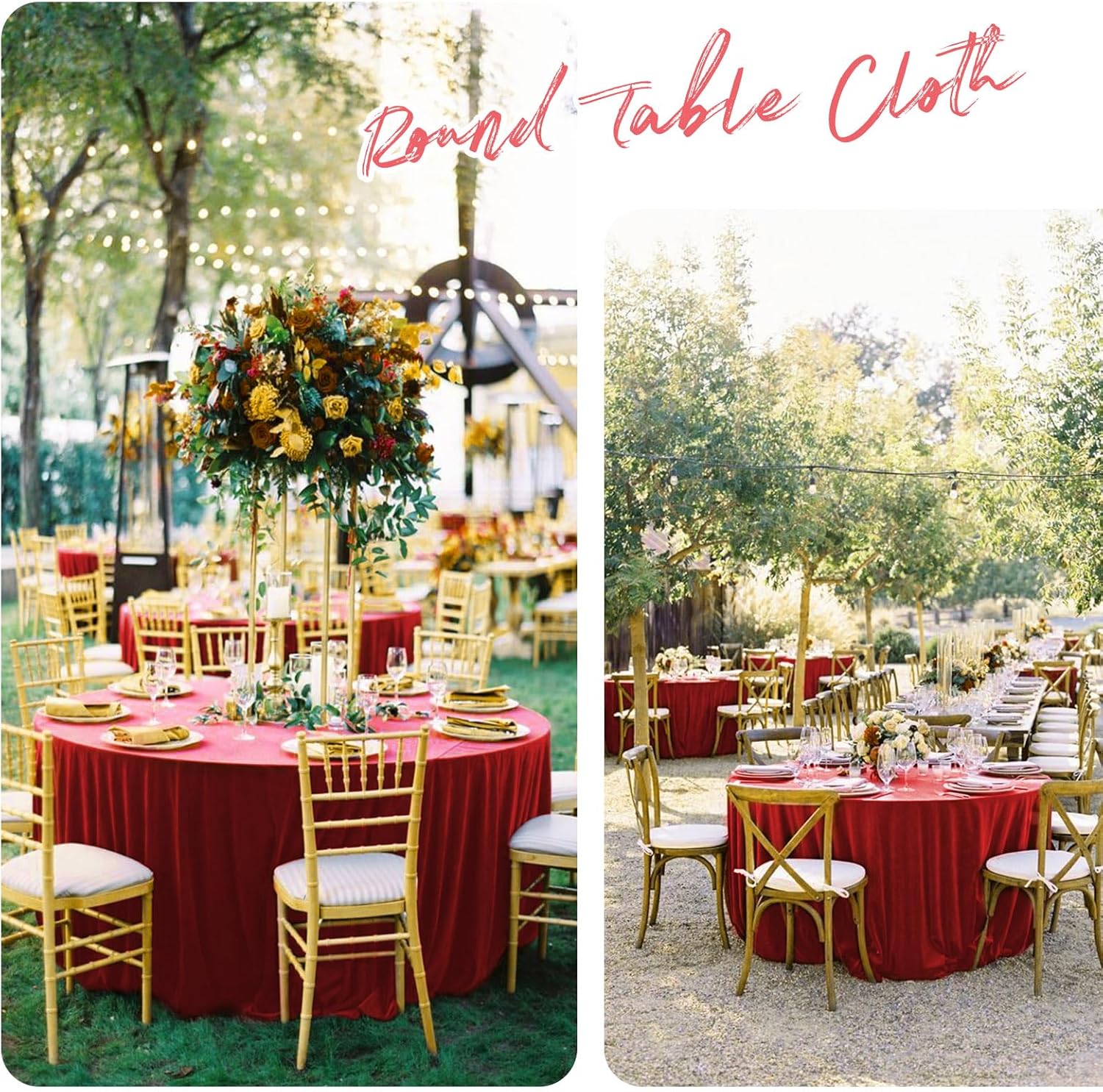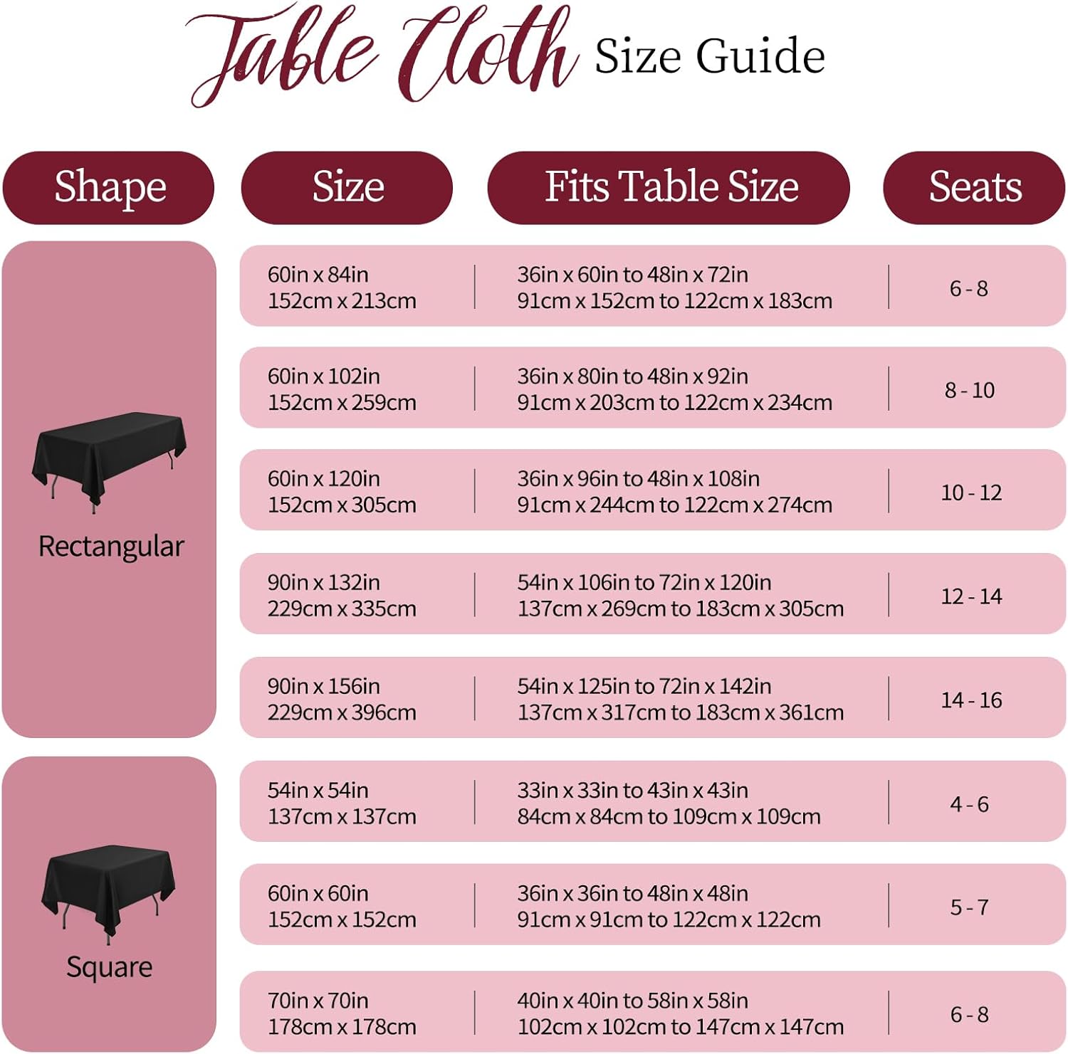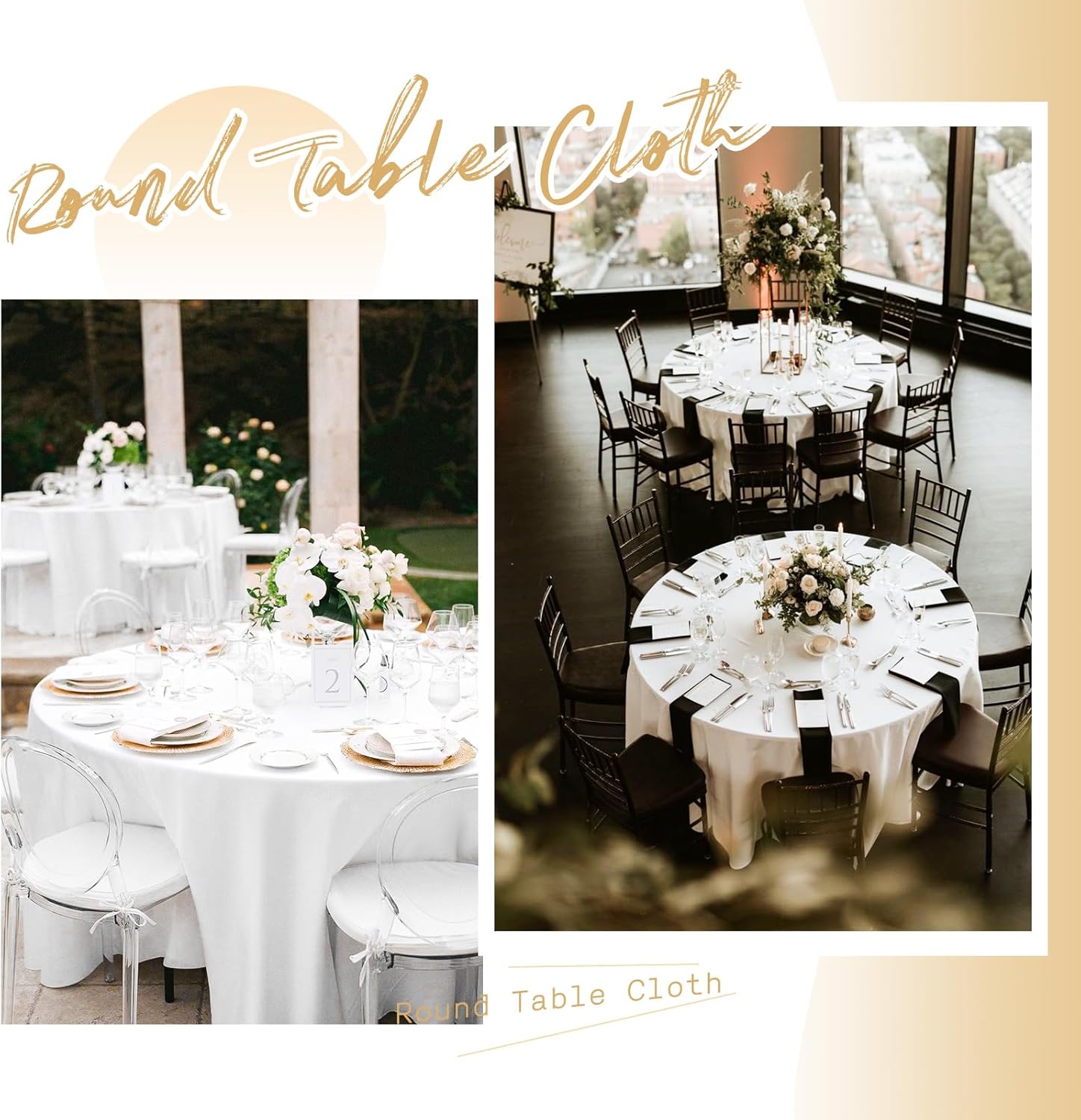 12 Pack 90" Round Polyester TableclothsQuantity: 6 packs, 10 packsMaterial: 100% Premium Polyester FabricSize: Round polyester tablecloths are available in: 60", 90", 108", 120"Rectangular polyester tablecloths are available in: 60" x 84", 60" x 102", 60" x 126", 90" x 132", 90" x 156"Square polyester tablecloths are available in: 52" x 52", 70" x 70", 85" x 85"Polyester Tablecloth Features:Classic solid color design with an elegant look, soft feel and beautifully stitched edges.It can be applied to all kinds of dining table furniture and provides good protection.Durable material, can be washed and reused many times, won't curl and tear after washing.Add an elegant touch to your event and your guests are sure to impress.Polyester tablecloths are suitable for various occasions:WeddingBridal ShowerBirthday PartyBanquetHotelCafeAlso works with various tables:Dining TableDessert Buffet tablePicnic TableReminder:1. In order to avoid buying the wrong size, please measure your table size before purchasing, and choose the tablecloth that suits you according to our size picture display.2. Manual measurement, there will be 1-2cm error, please understand.3. The computer screen and the mobile phone screen display different colors, and there will be color differences.