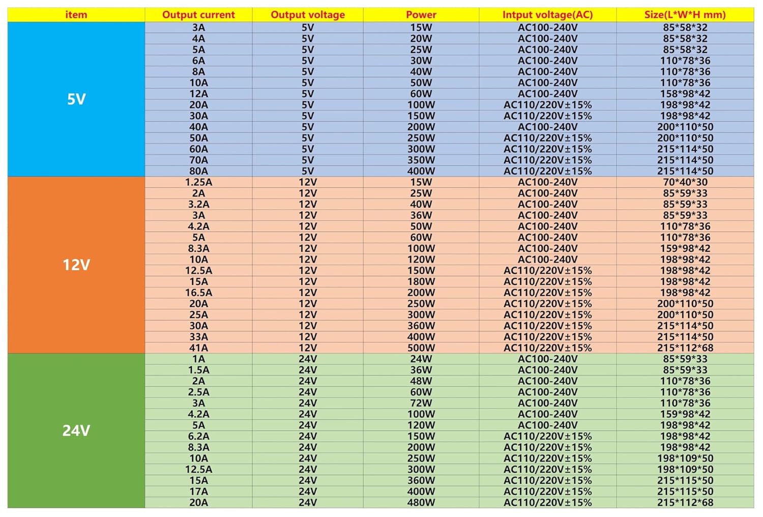 Power Suppliesdescribe:-Oxical material: metal shell-A safety compliance: FCC / CE- Cost-effective, industry-standard reliability-Built -in overvoltage, overcurrent, short circuit protection- Ambient humidity: 0~95% no condensation-100%full load aging test.Input AC110220V 5060HzOutput DC12V- Protection: overload/overvoltage/short circuit.- Cooled by natural air convection.-(It is not recommended to use in the bathroom)connect:- L, N: AC power input- GND: DC power output "-"-V: DC power output "+"- +V/ADJ: adjust the output voltageSafety Compliance: CCC/FCC/CE- Working temperature: 0~40℃- Storage temperature: -20~60 ℃- Ambient humidity: 0~95% no condensation- Safety Compliance: FCC/CE/Rohs- Cost-effective, industry-standard reliability- Built-in overvoltage, overcurrent, short circuit protectionfeature:- Built-in overvoltage, overcurrent, short circuit protection- PWM design ensures power supply stability and high efficiency.-Ant interference, through the EMC test, the waveform is less than 20mv.-Sengous voltage output, provide stable power supply for LED lighting to achieve long lifetypical application:-LED light bar power supply- Security monitoring industry- Other industrial applicationspack:1x switching power supply lighting transformer.