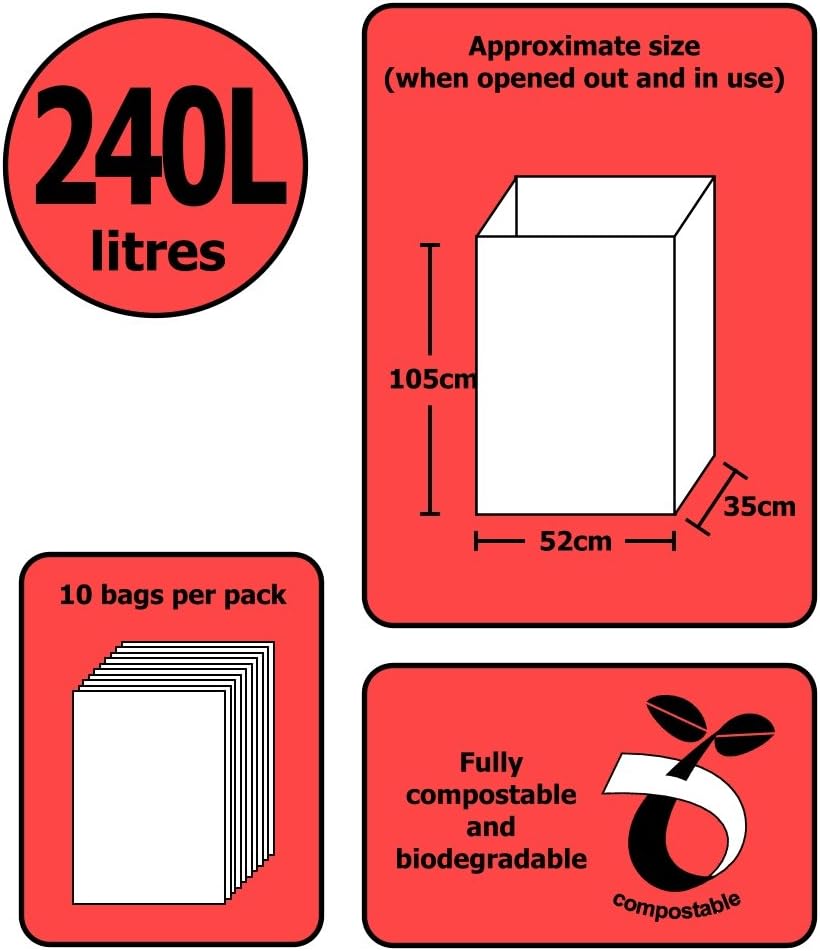 Product Description 240 litre Biodegradable & Compostable Wheelie Bin Liners Supplied with a guide to composting (Produced by All-Green) Contents: 10 bags Waterproofed paper, biodegradable and compostable as approved by many Local Authorities. Size: 240 litre - 870mm x 1050mm x 350mm (W x H x B) More info... All liners have the OK Compost and Din Certco Certification and the paper used is from a renewable resource - NOT hardwood trees from rainforests. Paper with full wet strength prevents any leak of the waste. Set Contains: 10x 240L paper bags