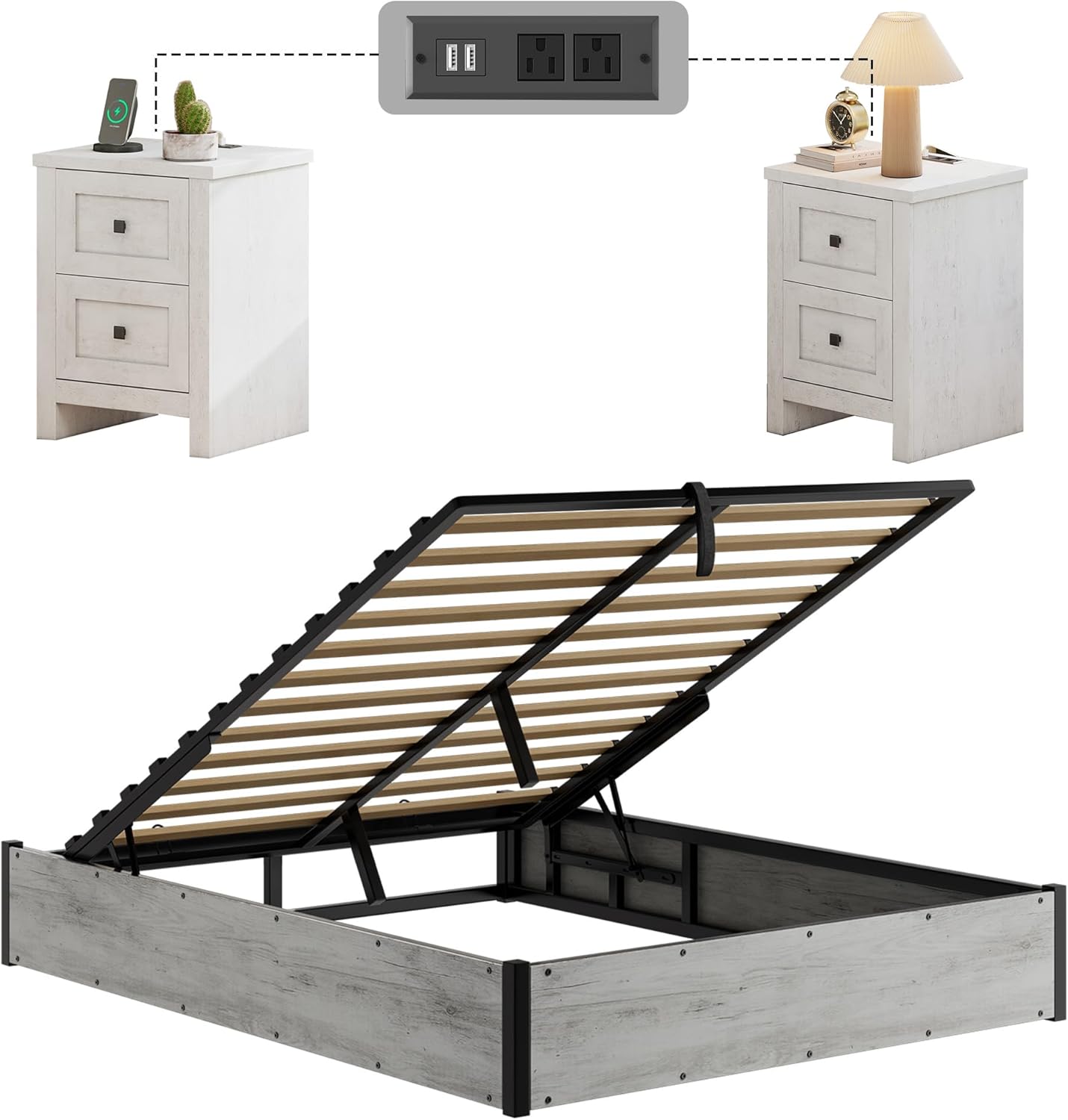 | Form Factor | Rectangular Lift-Up Storage Bed Frame with Rustic Nightstands |