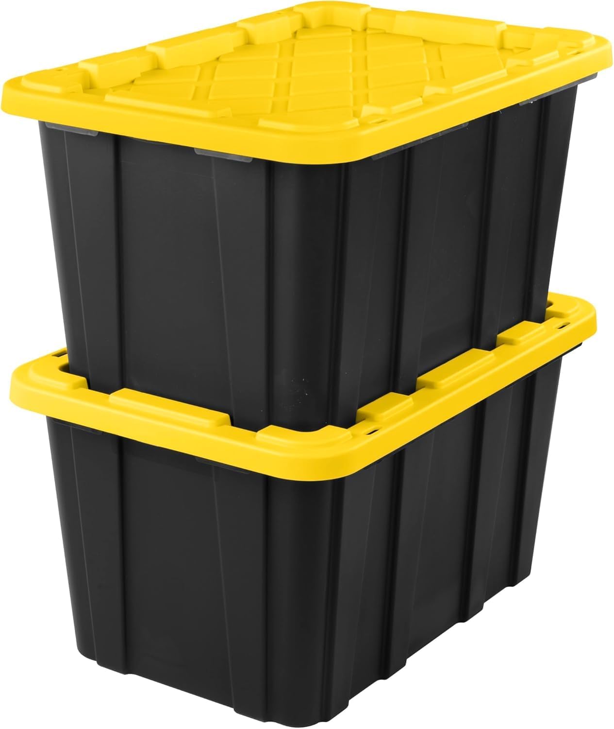 Meet our 6-Pack 27 Gallon Stackable Plastic Storage Bins with Lids—these industrial totes blend robust, heavy-duty construction (featuring channeled walls for added strength to resist crushing under typical loads) with practical design for home, garage, basement, closet, and office organization. Each container includes a reinforced snap-fit lid for secure closure (to protect stored items), while deep recessed lids enable stable stacking to better utilize your available storage space. Built with transport-ready details (grooved areas and keyhole designs in the lid for tie-down options) and comfort carrying handles for easy, convenient transport, these bins offer generous dimensions (28 1/2” L x 19 5/8” W x 15 1/2” H) to provide ample capacity for your needs. This Black & Yellow set works as versatile organizing containers—well-suited for active storage across multiple spaces in your home or workspace.