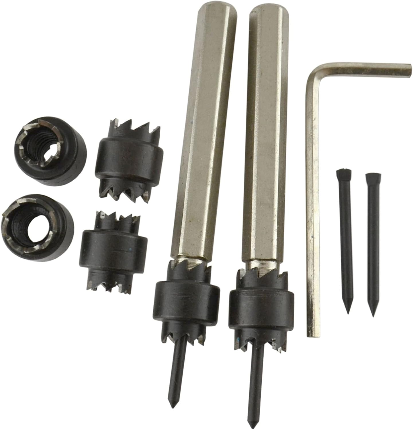 Perfect for removing spot welds cuts a groove around the circumference of the spot weld. Interchangeable heads. Includes cutters sizes 5/16" (8mm) and 3/8" (10mm). Each kit comes with 3 cutters of each size. Double ended cutters for longer lasting life of the kit. Chrome vanadium shank for strength and durability. Spare centring pins for when needed. HSS cutters. Includes; 1 x 5/16" spot weld cutter (complete) 2 x 5/16" spot weld cutter ends (double ended) 1 x 3/8" spot weld cutter (complete) 2 x 3/8" spot weld cutter ends (double ended) 2 x spare centralizing pins. 1 x Allen key for fast and easy change. Supplied in a blow molded case for easy storage and transportation.