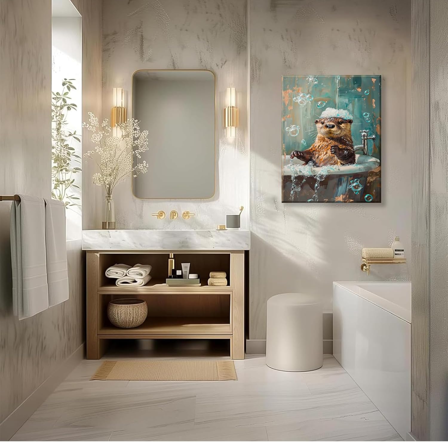 Bathroom Otter Canvas Wall Art Cute Bathtub Bubble Bath Otter Picture Wall Decor Funny Vintage Whimsical Animal Lover Poster Print Artwork for Bedroom Living Room Bathroom 16x24 In Canvas