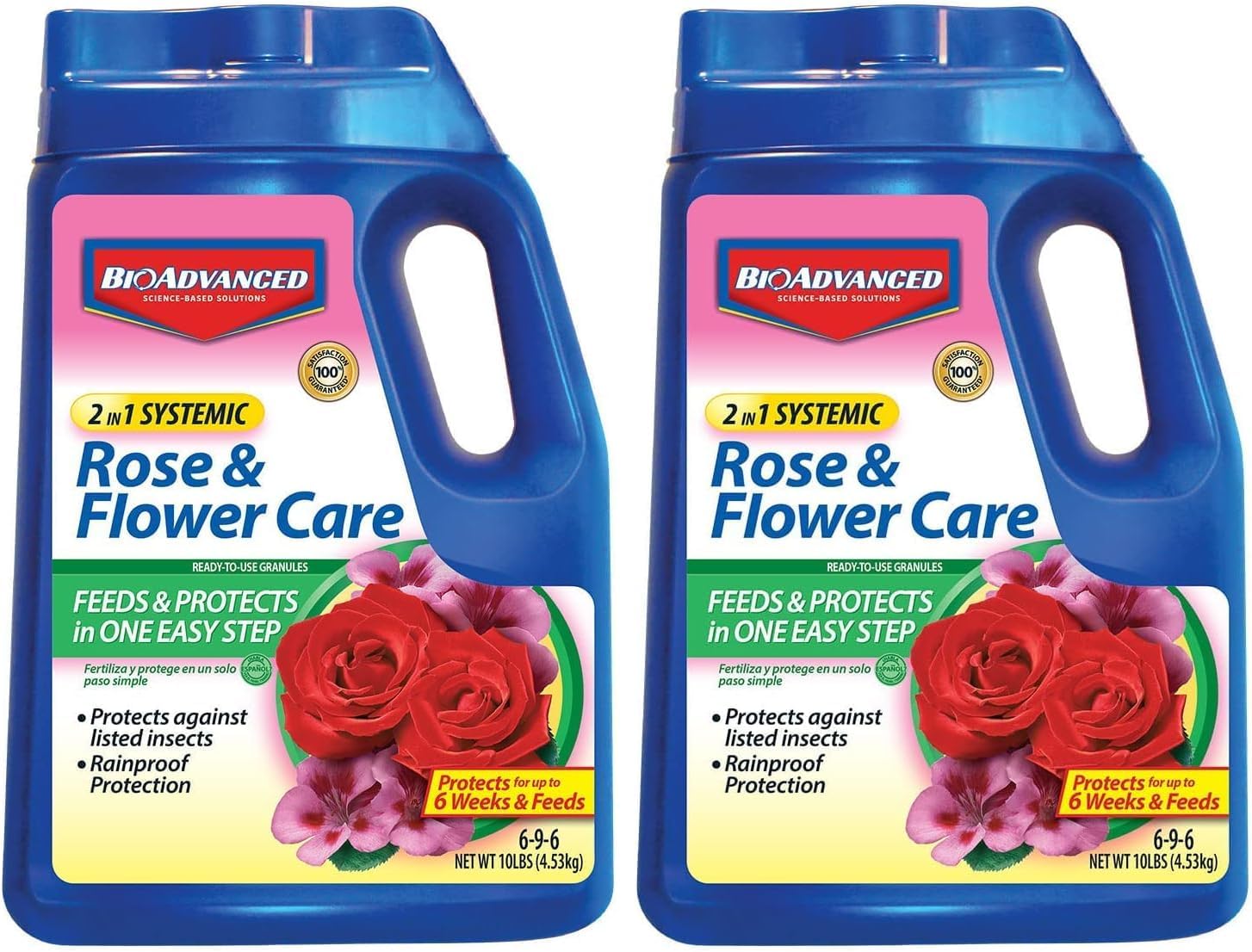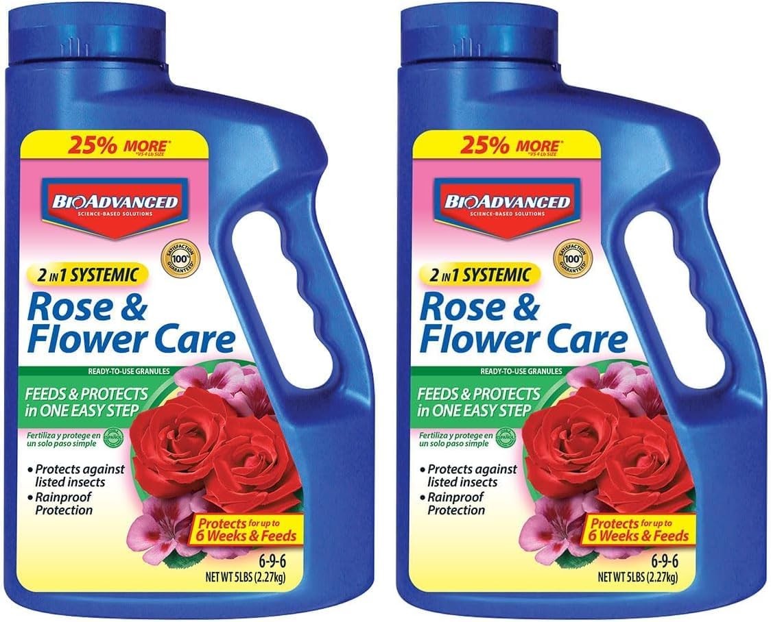 BioAdvanced 2-in-1 Rose and Flower Care feeds and protects your roses and plants in one easy step. It is specially formulated to both act as plant food and insect protection for up to 6 weeks. The plant food promotes strong roots and beautiful blooms. Just one application kills destructive insects such as aphids, lace bugs, leafhoppers, and more. The product is absorbed by the roots, protecting your plant from the inside out. Rainproof for 6 weeks, any rain or water will not wash away the effectiveness of the product. The ready-to-spread granules are easy to use. Simply apply the granules to the soil around the base of the plant. Work the granules into the top 1-2 inches of soil and water thoroughly after application. This BioAdvanced 2-in-1 Rose and Flower Care measures 10-Pounds and treats up to 36 rose bushes. Active Ingredients: 1.5% Acephate. EPA Registration Number: 192-211-92564. NPK Fertilizer Analysis: 6-9-6.