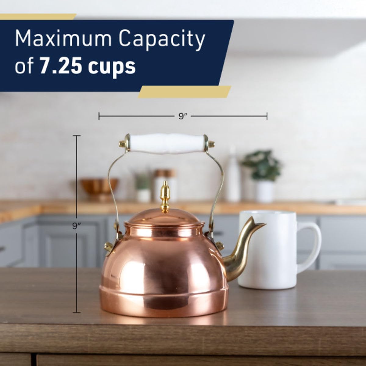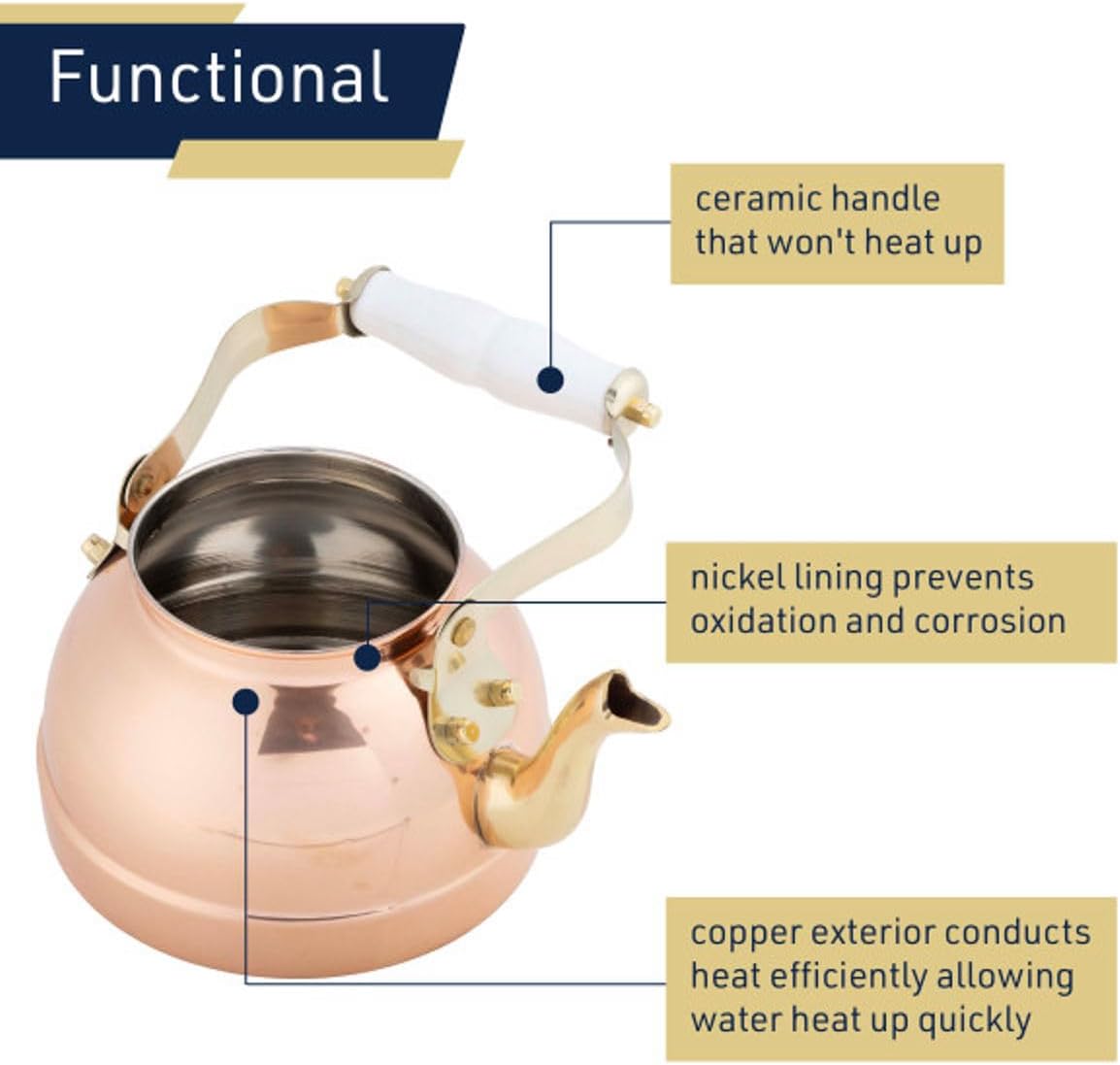 Boil water quickly and efficiently with the Tea Kettle Stovetop Kettles by Classic Cuisine, perfect for making piping hot cups of tea or coffee. This beautiful kettle pot is made with a copper exterior that provides superior heat conductivity for a faster boiling time, a nickel interior for enhanced durability and lasting use, and a ceramic handle that is comfortable to grip and won’t heat up like the rest of the kettle. Leave this vintage tea kettle on the stove even when not in use as it makes a gorgeous addition to any copper kitchen. Important: Classic Cuisine is committed to providing the consumer with the absolute best price and value on our entire line of products. Note: This is an exclusive product of Classic Cuisine and only Stove Top Kettles for Boiling Water by Classic Cuisine are guaranteed to be genuine. Avoid buying counterfeit products and transacting with unauthorized sellers.