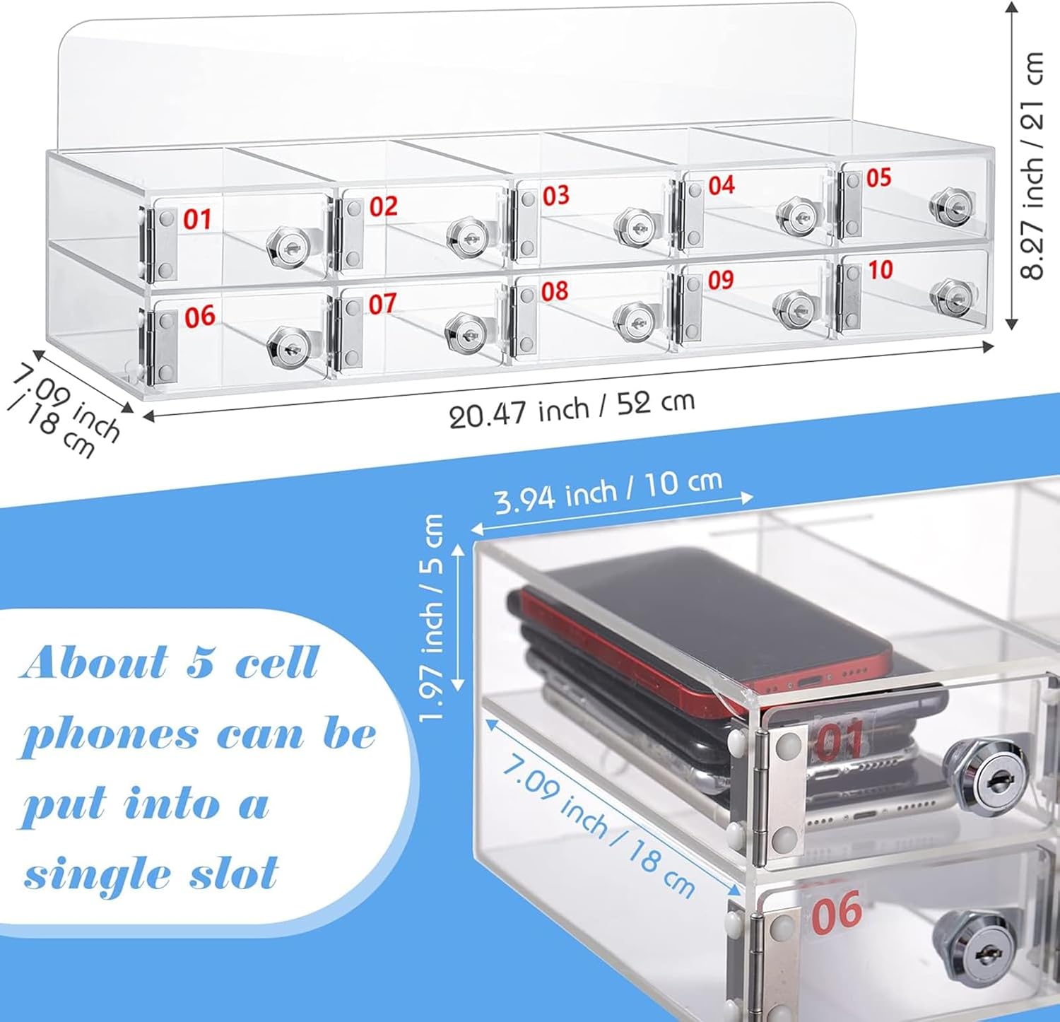 Introducing our 60 Slots Cell Phone Locker Box, a perfect solution for schools and workplaces seeking a secure and organized way to manage mobile phone storage. Designed to accommodate up to 60 devices, this wall-mounted phone storage unit is ideal for classrooms, offices, and events where keeping phones safe and out of the way is essential. The locker features durable door locks and comes with keys, providing peace of mind that your devices are secure. Its easy installation process means you can set it up quickly without hassle, ensuring that both students and employees can utilize it efficiently. Imagine a busy classroom where students are focused on learning without the distraction of their phones. Our cell phone locker box allows educators to promote a more engaged learning environment. In workplaces, it helps maintain productivity by reducing phone-related distractions, all while ensuring that employees' devices are stored safely. Crafted with high-quality materials, this locker box is built to withstand daily use, making it a cost-effective storage solution. The sleek design fits seamlessly into any environment, whether you are managing a school, organizing an event, or setting up a workspace. By investing in our cell phone locker, you are enhancing the overall safety and organization of your space. Say goodbye to cluttered desks and lost devices, and embrace a more structured approach to mobile phone storage. Upgrade your storage solutions today with our 60 Slots Cell Phone Locker Box, and experience the convenience it brings to your daily operations.