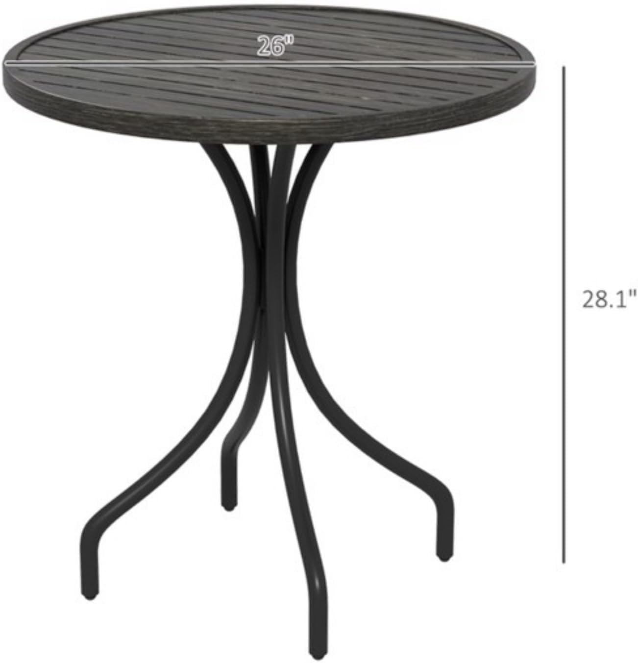 Large tabletop for drinks and snacks, slatted tabletop prevents water accumulation, suitable for patio, balcony, deck or garden Specifications: - Color: distressed gray, black - Material: galvanized steel - Overall dimensions: 26 inches in diameter x 28.25 inches in height - Weight capacity: 66 lbs. Package includes: - 1 x outdoor side table - 1 manual
