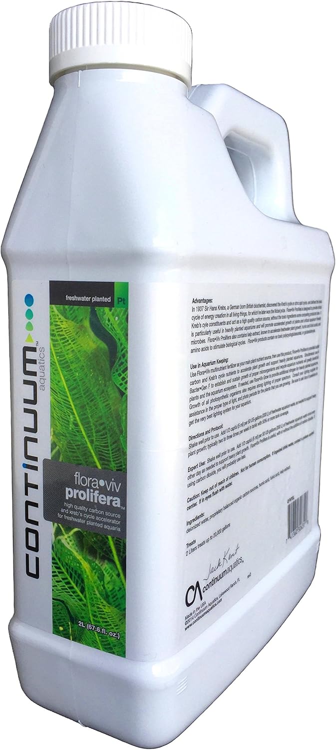 In 1937 Sir Hans Krebs, a German born British biochemist, discovered the Kreb's cycle or citric acid cycle and defined the basic cycle of energy creation in all living things, for which he later won the Nobel prize. "FloraViv Prolifera" is designed to provide critical Kreb's cycle constituents and act as a high quality carbon source, without the toxic ingredients some competing products have. It is particularly useful in heavily planted aquariums and will promote accelerated growth of plants and critical aquarium friendly microbes. "FloraViv Prolifera" also contains kelp extract, known to accelerate freshwater plant growth, humic and fulvic acids and amino acids to stimulate biological cycles.