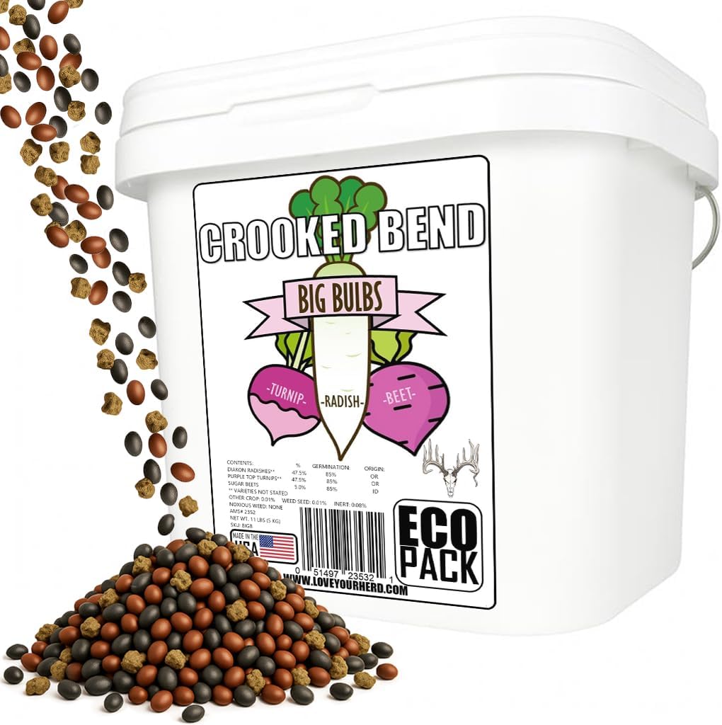 Introducing Big Bulbs Food Plot Seed Mixture by Crooked Bend – the ultimate solution for attracting and nourishing wildlife on your property. Specially formulated with a powerful blend of 47.5% daikon radish seeds, 47.5% purple top turnip seeds, and 5% sugar beet seeds, this food plot mix is designed to thrive when planted in late summer, ensuring a lush and bountiful forage by fall. The dual-attraction of this mix lies in its ability to appeal to whitetail deer and turkey, offering both nutritious foliage tops and delectable root bulbs that keep wildlife coming back. Our premium seed blend combines the best of nature’s offerings, featuring high-quality daikon radish, purple top turnip, and sugar beet seeds that create a diverse and nutrient-rich diet for wildlife. This mix is engineered for optimal growth, making it an ideal choice for late summer planting to achieve a fully grown, dense food plot by the fall season. The robust and versatile growth conditions ensure that Big Bulbs can thrive in various soil types and weather conditions, providing a reliable and sustainable food source for your land. Big Bulbs Food Plot Seed Mixture not only attracts and sustains wildlife but also promotes healthy deer and turkey populations. The nutrient-packed forage supports robust antler growth in deer and enhances overall wildlife activity on your property, creating prime opportunities for wildlife views. Additionally, the deep-rooting nature of daikon radishes and turnips helps aerate the soil, improving its structure and fertility over time, making Big Bulbs a beneficial addition to your land management strategy. No need to till your soil just throw the seed and let it grow. Keep the soil consistently moist until germination to guarantee a successful growth period leading up to the fall season. With proper care, your Big Bulbs food plot can provide sustenance for wildlife throughout the fall and into the winter months, ensuring a long-lasting impact on your property.