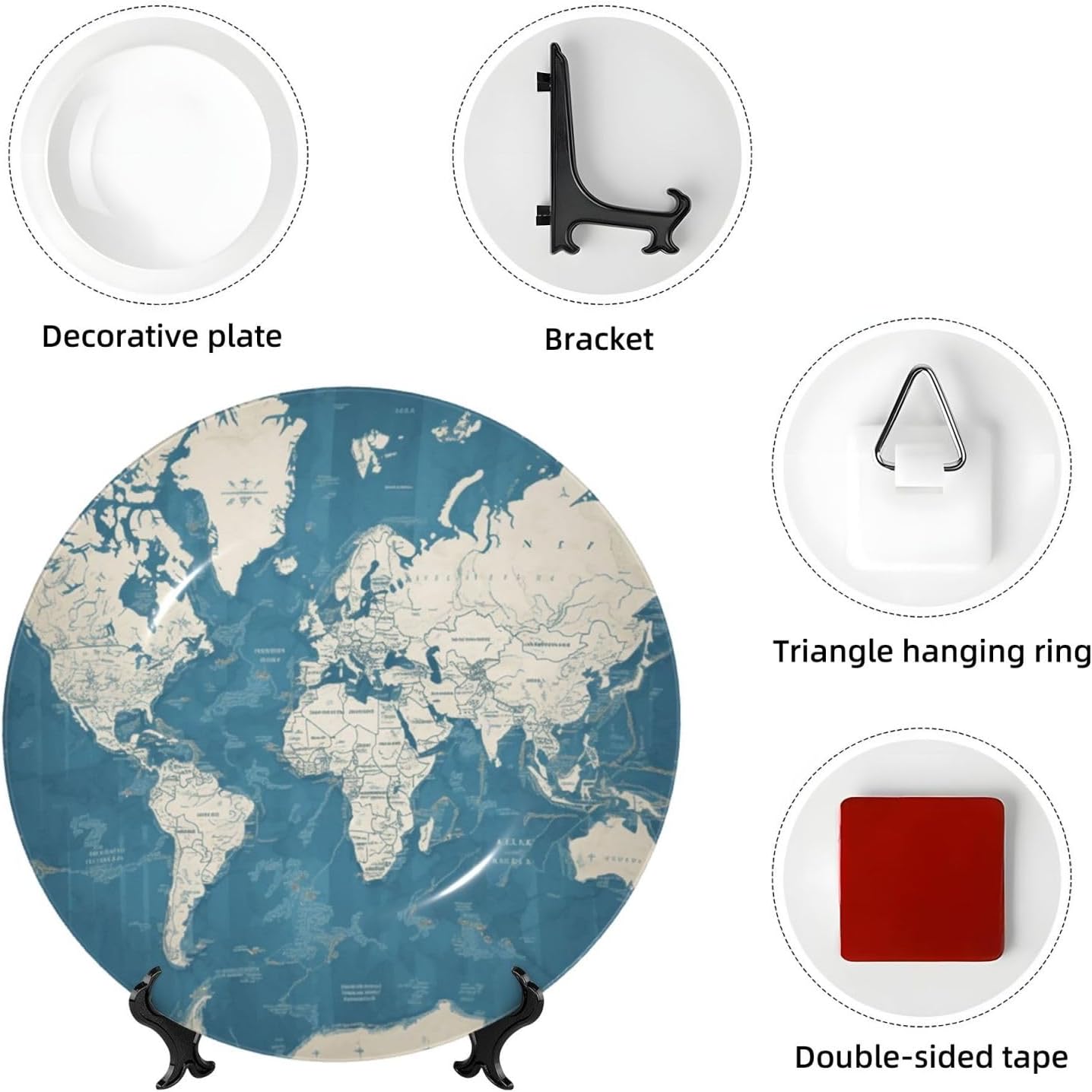 gokays decorative platedo you feel that your table is monotonous? Then use our decorative plate to add a little fun to the monotony of life.featuressize - 6 inch diameter;7 inch diameter;8 inch diameter;10 inch diametermaterial - ceramic design - Blue map of The World package - 1 x ceramic decorative plate, 1 x stand, 1 x pothookwhy choose gokays decorative plates?advantageas manufacturers we follow current trends and bring you the latest home fashion. Salad plates ideal for placement at home or in the office. Traditional porcelain making technology, fine workmanship. Ceramic dinner plates is a good gift for family and friends.convenient to useour dinner plates rack for display has 2 ways to use, you can just place the bracket base on a flat surface first, and then put the plate on it, also you can stick the provided pothook at the back of the plate, and then stick the plate on the wall, you can choose the suitable installation method according to the actual situation.occasionour ceramic ornaments salad plates is a perfect decorative and collection for any niche, table, or mantle at your home. Perfect for your office, home, living room, dining room, playroom, kitchen, cafe, study, studio, club, bar, and others.in a surprise for your family and friends!porcelain dessert plates is a perfect gift for any person in your life. You can give it directly to your lover as mother's day gift/father's day gift/birthday gift/christmas gift/valentines day gift/anniversary gift/wedding gift/housewarming gift/new home gift.start with our funny decorative plate, refresh your rooms!