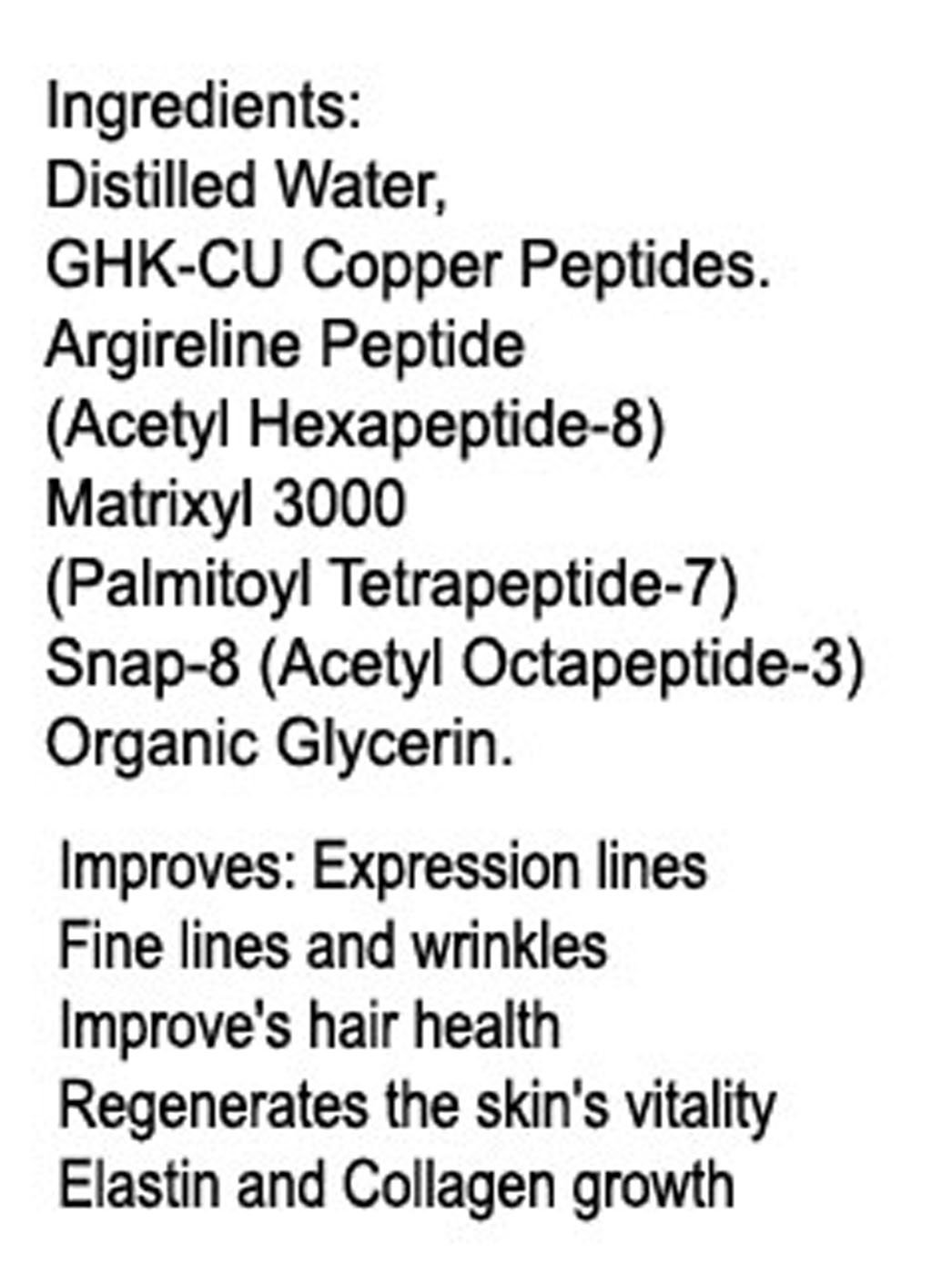 DNA Code Magic No Needle Alternative-Argireline Copper Peptide Serum Booster w/ Matrixyl 3000 and SNAP-8. BENEFITS:Relaxes facial tension leading to a reduction of facial lines and crow's feet. Improves texture and depth of wrinkles around eye area. Stimulates production of collagen and elastin. Promotes healing through cell turnover. Helps restore UV damaged skin tissue. Strengthens and thickens the delicate skin and around the eye.