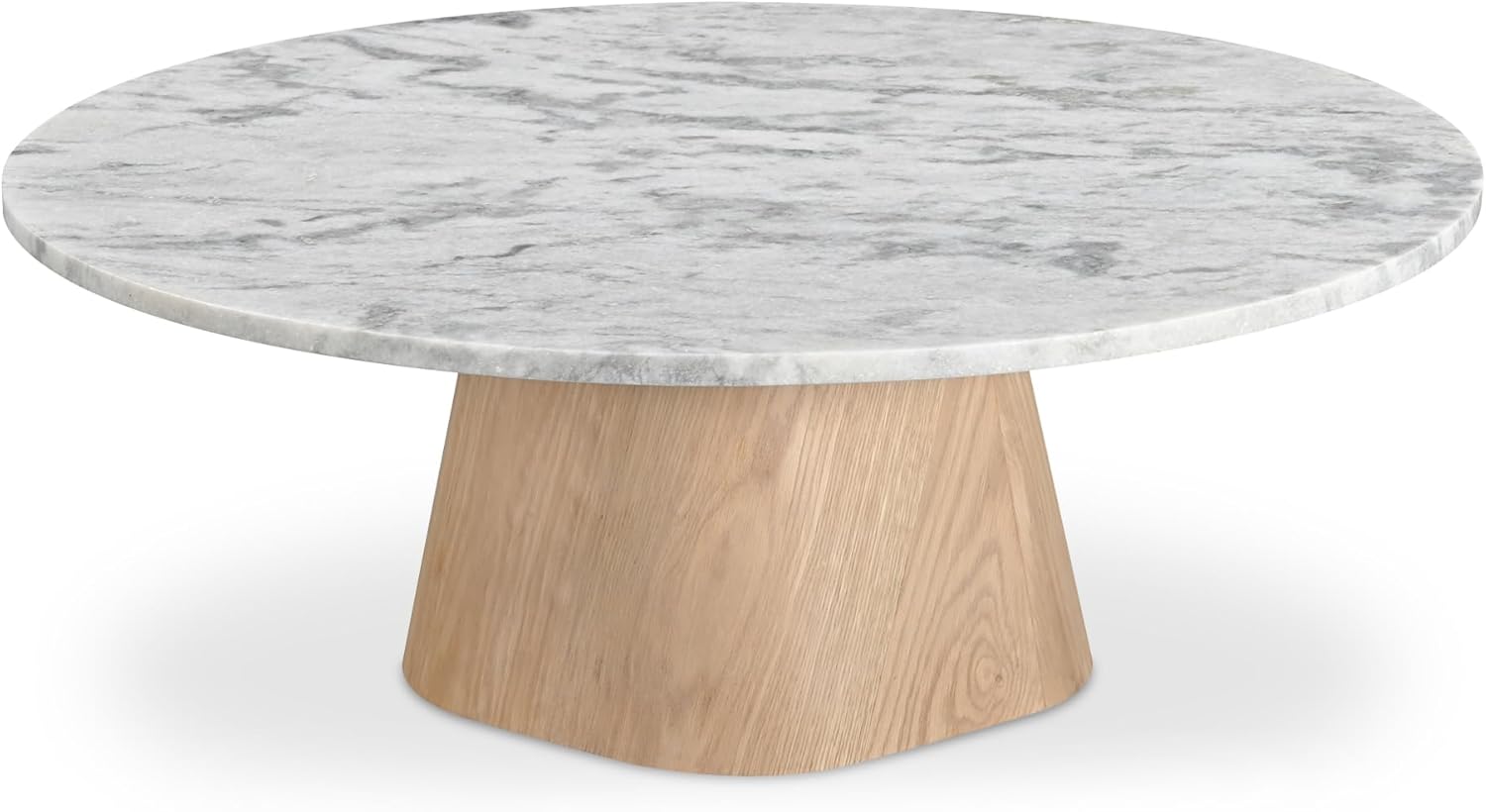 Meet Eden—a coffee table where sculptural form meets refined materiality. The Eden Coffee Table from Nadaal Studios showcases a round Raj Grey marble top paired with a contrasting oak veneer base, celebrating both texture and tone. Each table features unique marble veining, making every piece a one-of-a-kind statement. With its seamless blend of softness and strength, Eden invites elevated design into your living space, all while standing up to the rhythms of daily life.