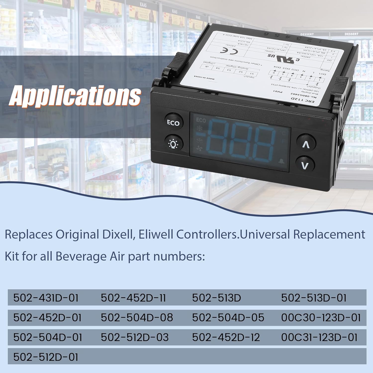 • 【Perfectly compatible】Alternative Dixell, Eliwell (pre-programmed controllers). The ERC112D temperature controller is a universal replacement kit for all Beverage Air part numbers: 502-431D-01 / 502-452D-01 / 502-504D-01 / 502-512D-01 / 502-452D-11 / 502-504D-08 / 502-512D-03 / 502-513D / 502-504D-05 / 502-452D-12 / 502-513D-01 / 00C30-123D-01 / 00C31-123D-01