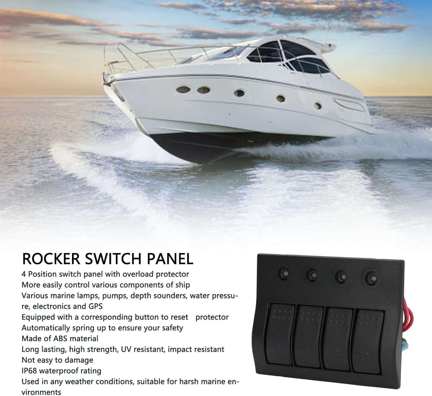 Spec: Item Type: Rocker Switch Panel Material: ABS Working Voltage: DC12V 24V Number of Overload Protectors: 4(2x10A and 2x15A) Panel Size: Approx. 130 x 100mm / 5.12 x 3.94in Drilling Hole Size: Approx. 108 x 83mm / 4.25 x 3.27in Level: IP68 Application: For headlight switch, fog light switch, width lamp switch, car refrigerator switch, car vacuum cleaner switch, etc. Use: Suitable for installation in luxury transportation tools like boats, yachts, RVs, buses, etc. How to Use: With pre wiring, red for positive terminal, black for negative terminal, connect and use. PackageList: 1 x Switch Control Panel 4 x Sticker 4 x Installation Screws(random color) 4 x Connecting Cable