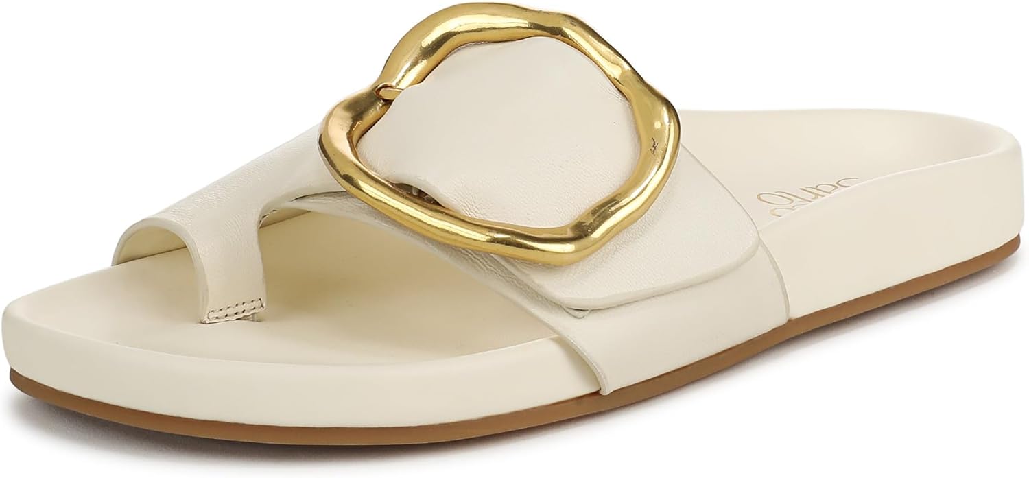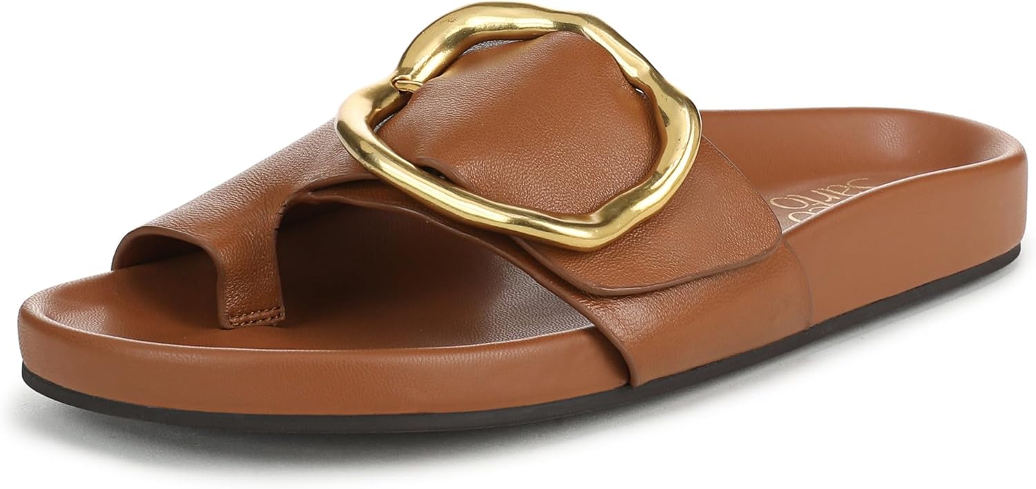 Your go to slide sandal. This style will perfectly elevate every look this season. Leather upper crafted with eco-conscious materials. Slip on design. Metallic ornament detail. Round toe.
