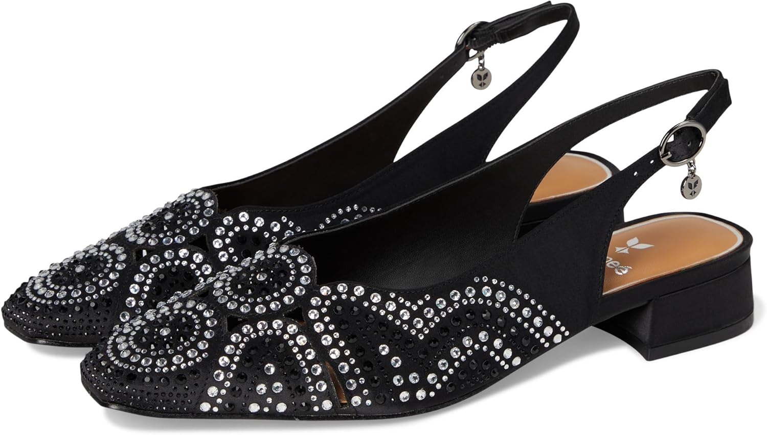 This year-round women's fabric/rhinestones square toe pump has a memory foam+latex insole and synthetic lining and comes in sizes M 5-11 12 13 W 7-11 12 13. This style also features a buckle closure on a 1 inch heel.
