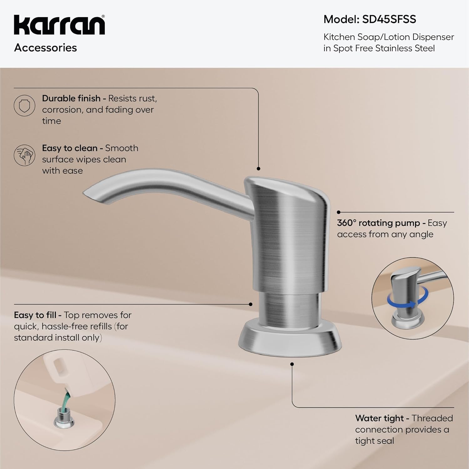 Upgrade your kitchen with the Karran SD45 Soap & Lotion Dispenser—an elegant, heavy-duty accessory designed to match today’s most popular faucet finishes. Whether you choose Chrome, Stainless Steel, Matte Black, Gunmetal, or Champagne Bronze, each finish is crafted to resist fingerprints, spots, and water marks while delivering long-lasting shine. The SD45 offers dual refill flexibility, giving you the freedom to refill from above the counter using the included 10 oz bottle or connect directly to any large store-bought soap bottle in your cabinet with the 47" silicone extension hose. No more messy refills, awkward reaching, or running out of soap mid-task. Built for busy kitchens, the SD45 features a commercial-grade self-priming pump that dispenses smoothly and consistently without clogging. A built-in backflow preventer keeps soap clean and fresh by preventing contaminated liquid from returning to the bottle. Premium construction ensures corrosion, rust, and wear resistance, offering long-term performance for thousands of pump cycles. Designed to fit standard 1-1/4" installation holes and most countertop materials, this dispenser installs easily and pairs seamlessly with Karran faucets for a coordinated, high-end look. With modern styling, spot-free finishes, and truly effortless refilling, the SD45 Soap Dispenser is the perfect upgrade for homeowners who want both convenience and refined design. Keep your sink area cleaner, your soap supply plentiful, and your kitchen looking beautifully coordinated—every single day.