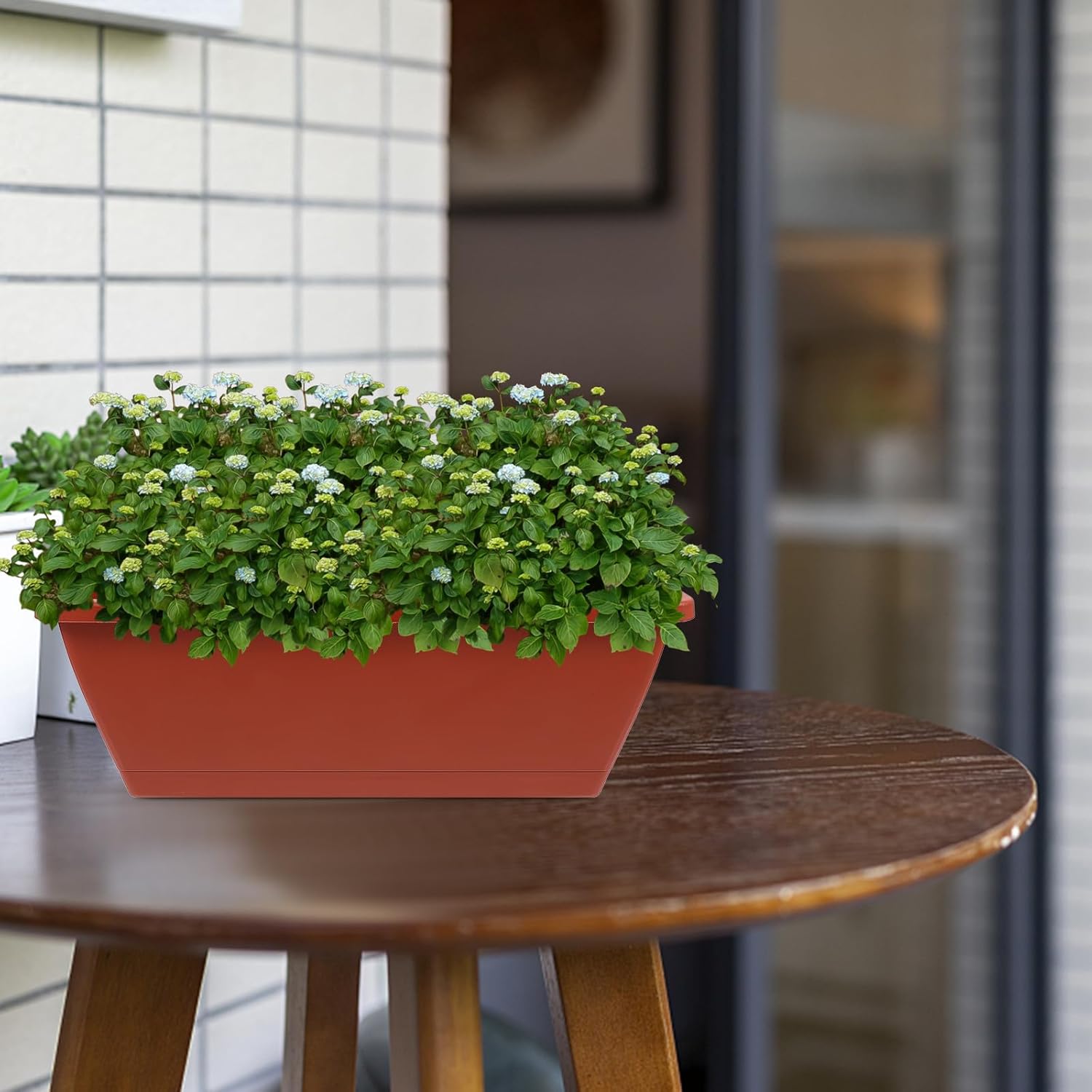 Kisangel 6pcs Plastic Planting Pots Set, Medium Rectangular Flower Planters 43cm X 18.5cm X 13cm, Brick Red with Drainage Trays, Indoor Balcony Vegetable and Succulent Containers