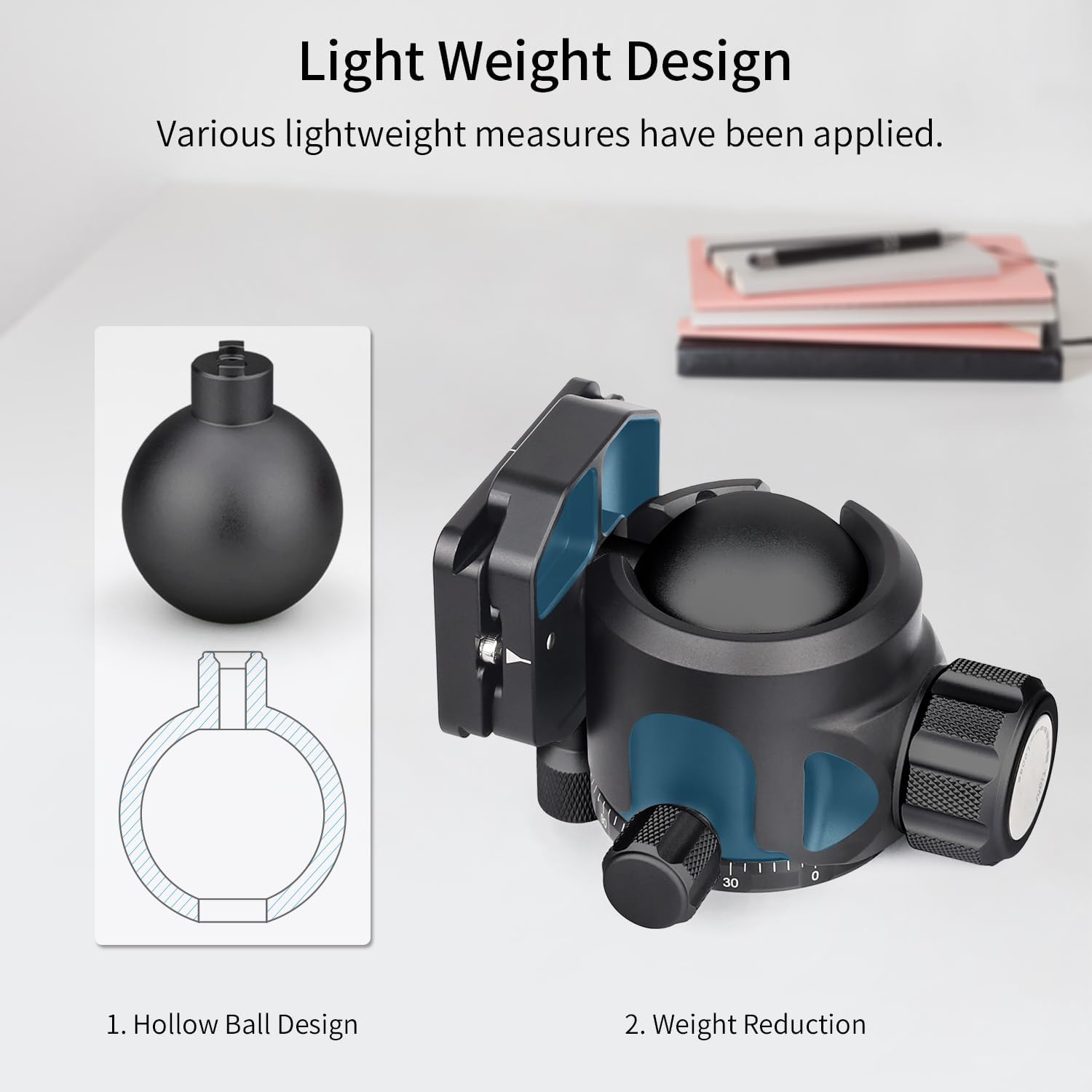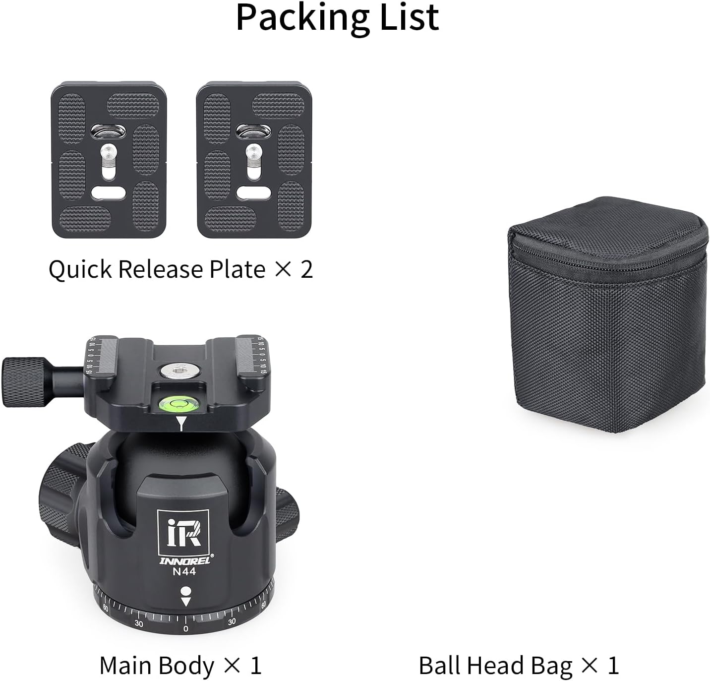 Low Profile Ball Head Metal Tripod Ball Head 44MM Ball Diameter INNOREL Panoramic CNC Ball Heads Camera Mount with Two 1/4" Quick Release Plates for Tripod, DSLR, Camcorder, Max Load 55lbs/25kg The ball head with 1/4” screw arca swiss quick release plate and 3/8” screw hole. Compatible with tripod, monopod, slider, DSLR camera, camcorder, telescope ,phone etc. Low Profile >> 20% Lower Center of Gravity Material >> High Strength Aviation Aluminium Alloy Size >> Ball Diameter: 44mm, Base Diameter: 58mm, Height: 85mm Quick Release Plate Size >> 2.36in x 1.73in x 0.39in Packing List: Ball Head*1 Quick Release Plate*2 Ball Head Bag*1