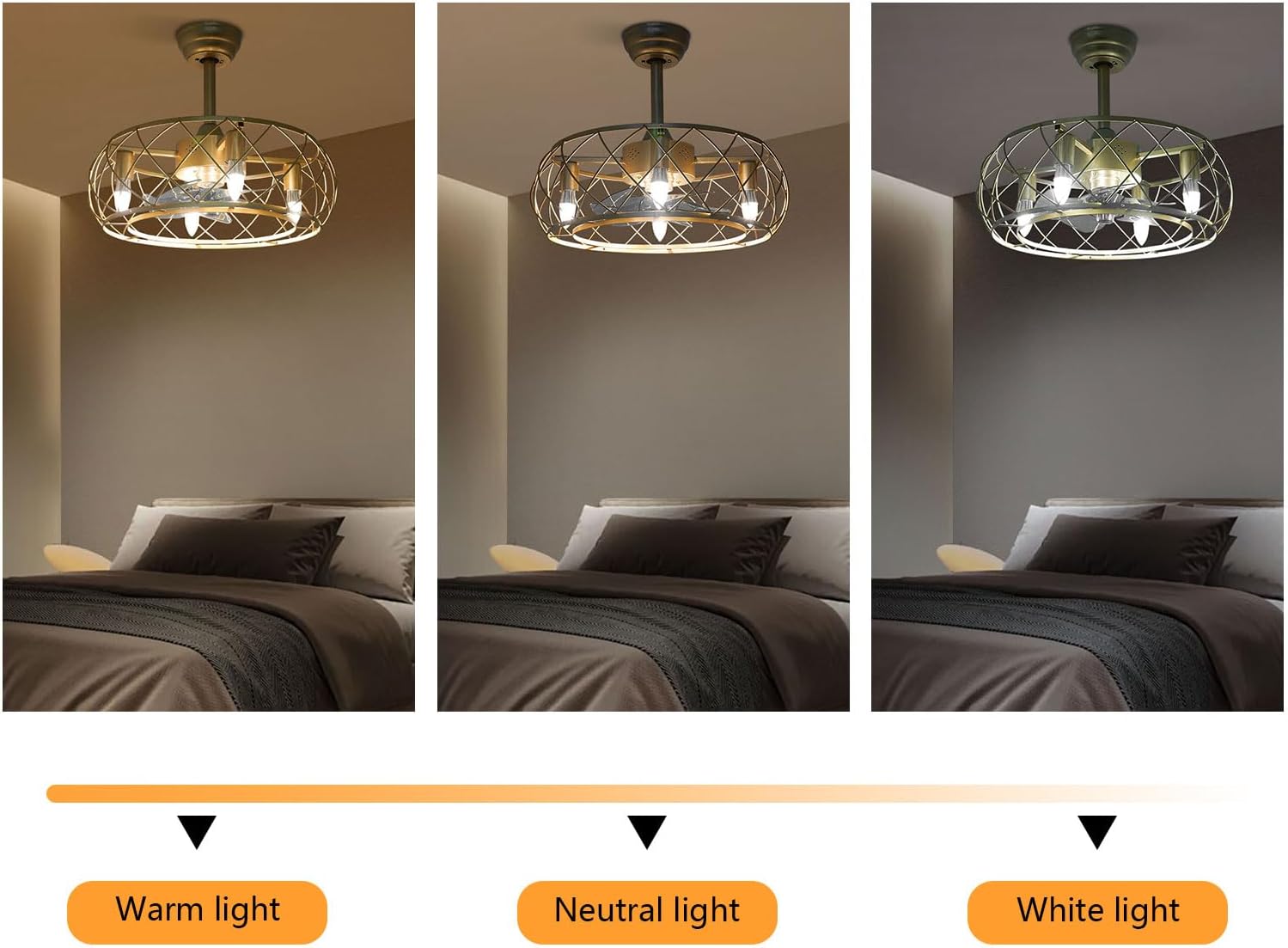 SpecificationsColor: GoldMaterial: IronProcess: Paint SprayingMotor Type: Brushless Pure Copper MotorMount Type: Ceiling MountedAssembly Required: YesEfficiency: EWind Speed Settings: 3 SettingsTime Setting: 1/2/4/8 HoursLight Source: 4*E26(Not Included)Each Bulb's Power: 40W(Maximum)Noise: 35dBIllumination Area: 15-20m²/161.46-215.28ft²Suitable Height: 2.65m/8.69ftRemote Control Distance: 3-5m/9.84-16.4ftLampshade Size(D*H): 50*18cm/19.68*7.08inRod Length: 10cm/3.94in, 20cm/7.87inBase Diameter: 15cm/5.9inPackage Size: 55*55*28cm/21.65*21.65*11.02inGross Weight: 5.21kg/11.49lbsNet Weight: 4.95kg/10.91lbsPackage Included1* Ceiling Fan with Light1* Remote Control1* English ManualOther Needed AccessoriesNotes1. Please check the size carefully before ordering.2. You need 4 E26 bulbs with a single bulb less than 40W (not included). 3. It is normal that the expansion screw will blow up after the force is applied.4. Please make sure the power is cut off before installation. To ensure your safety, we recommend that two people install this light together. Please install it by someone with an electrical license if necessary.5. For a safe and secure installation, please ensure that the electrical box is firmly mounted and properly attached to a structural part of the building. Please make sure that all wires are connected and all screws are firmly tightened. When unpacking, be careful not to pull on the wires, as a bad connection may result. Please do not turn on the power until fully assembled.6. Please do not install it next to the air conditioner or heater, which will affect the service life of the product. Please wear electric insulation gloves (not included) and avoid scratching the surface of the product and the electric wire when installing. Please conduct a power test before installation.7. Please use this item within the applicable voltage range and clean it regularly. Please wipe with a soft cloth. It is not suitable to clean with cleaning agents.