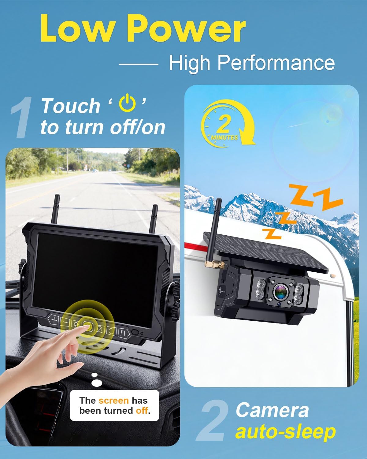 | BuiltIn Media | 1 * 3M Sticker + 4 * Screw + 1 * User Manual, 1 * 7 Inch Touchkey Monitor, 1 * Charge Plug + 2 * USB to type-c cable for camera, 1 * USB to DC cable for monitor + 1 * Cigarette Lighter Plug, 2 * Solar-Powered Wireless Backup Camera + 2 * Iron Sheet Bracket |