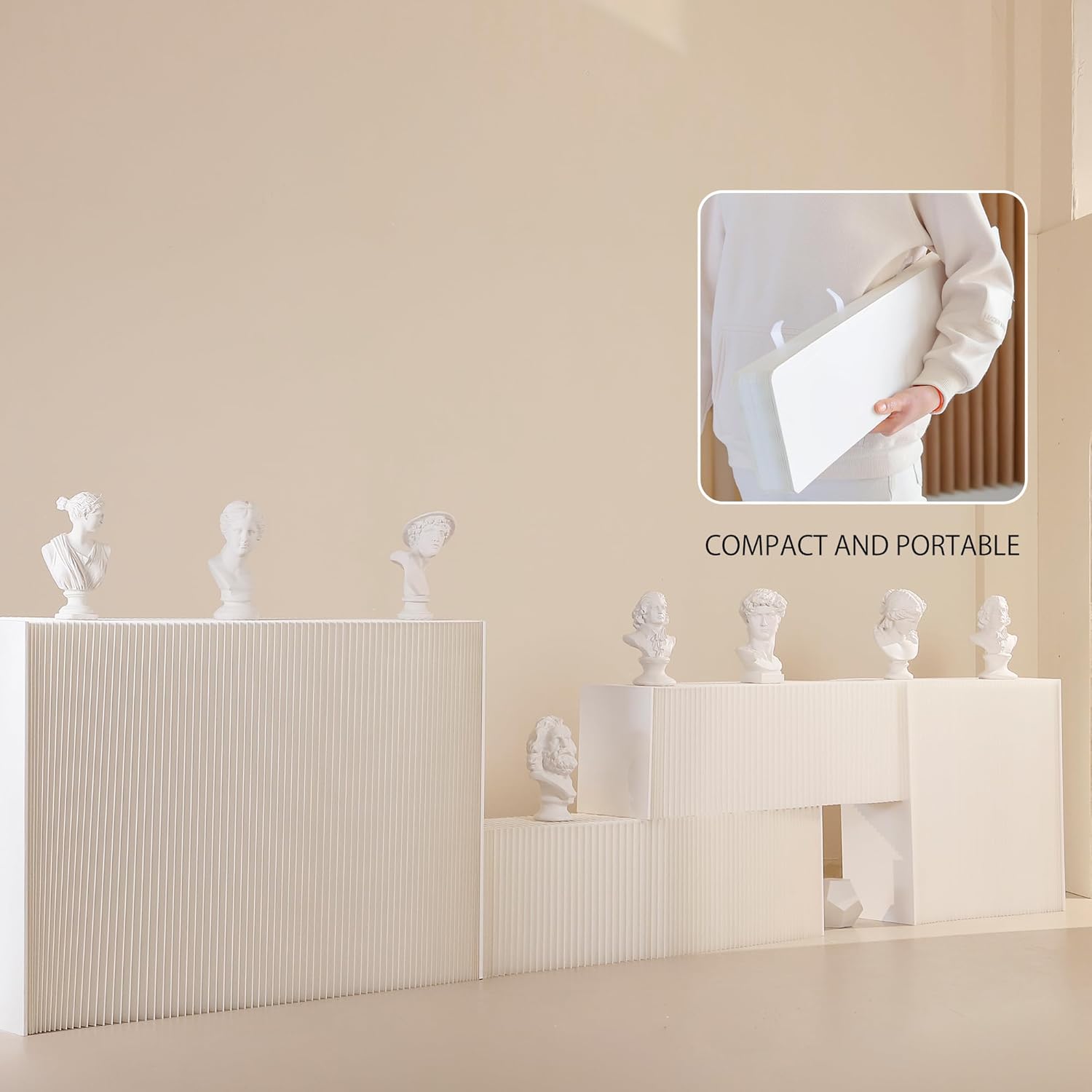 Transform your retail space with this sophisticated expandable display stand featuring an eye-catching pleated design. The modular structure combines clean white and warm brown finishes to create a contemporary aesthetic that elevates any showcase environment. Perfect for boutiques, trade shows, public halls, and retail spaces, these versatile platforms offer multiple configuration options to highlight merchandise, from luxury accessories to decorative items. The distinctive accordion-style texture adds visual interest while providing stable display surfaces at varying heights. Each unit can be arranged independently or combined to create custom layouts that maximize your presentation space. The sleek, minimalist design seamlessly integrates with modern interior décor, while the durable construction ensures long-lasting performance in high-traffic commercial settings. These display risers make an elegant statement whether showcasing handbags, cosmetics, artwork, or retail merchandise. Their adaptable nature allows for easy rearrangement to keep your displays fresh and engaging throughout different seasons and promotional needs.
