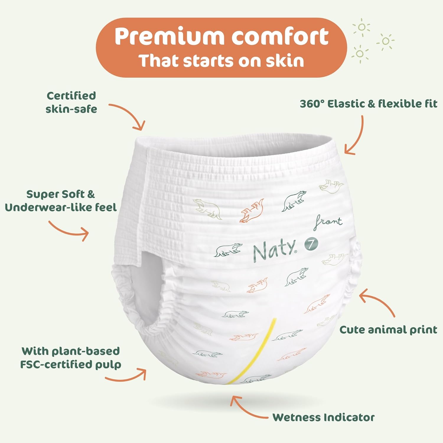 Naty FreeMovers Diaper Pants are designed for the crawling, cruising, and constantly-on-the-move stage of your baby’s development. These pull-on diaper pants combine soft, breathable materials with flexible, gentle construction to support active babies or toddlers during potty training or everyday wear. With an underwear-like feel and a comfortable, breathable waistband, FreeMovers deliver the independence kids love and the protection parents trust. Each training pant features a high-performance absorbent core made with FSC-certified pulp and supersabsorbents for fast absorption and reliable dryness helping reduce the risk of irritation for sensitive skin. The 360° stretchy fit moves naturally with your baby, while tear-away sides and a closing tab make quick changes easier at home or on the go. Certified skin-safe and made without fragrance, lotion, or latex, these toddler training diapers are ideal for babies with delicate skin. Scandinavian forest-animal prints add a playful touch inspired by Naty’s Swedish roots. With 30 years of expertise in certified skin-safe hygiene care, Naty delivers performance, comfort, and thoughtful design in every Freemovers diaper pant.