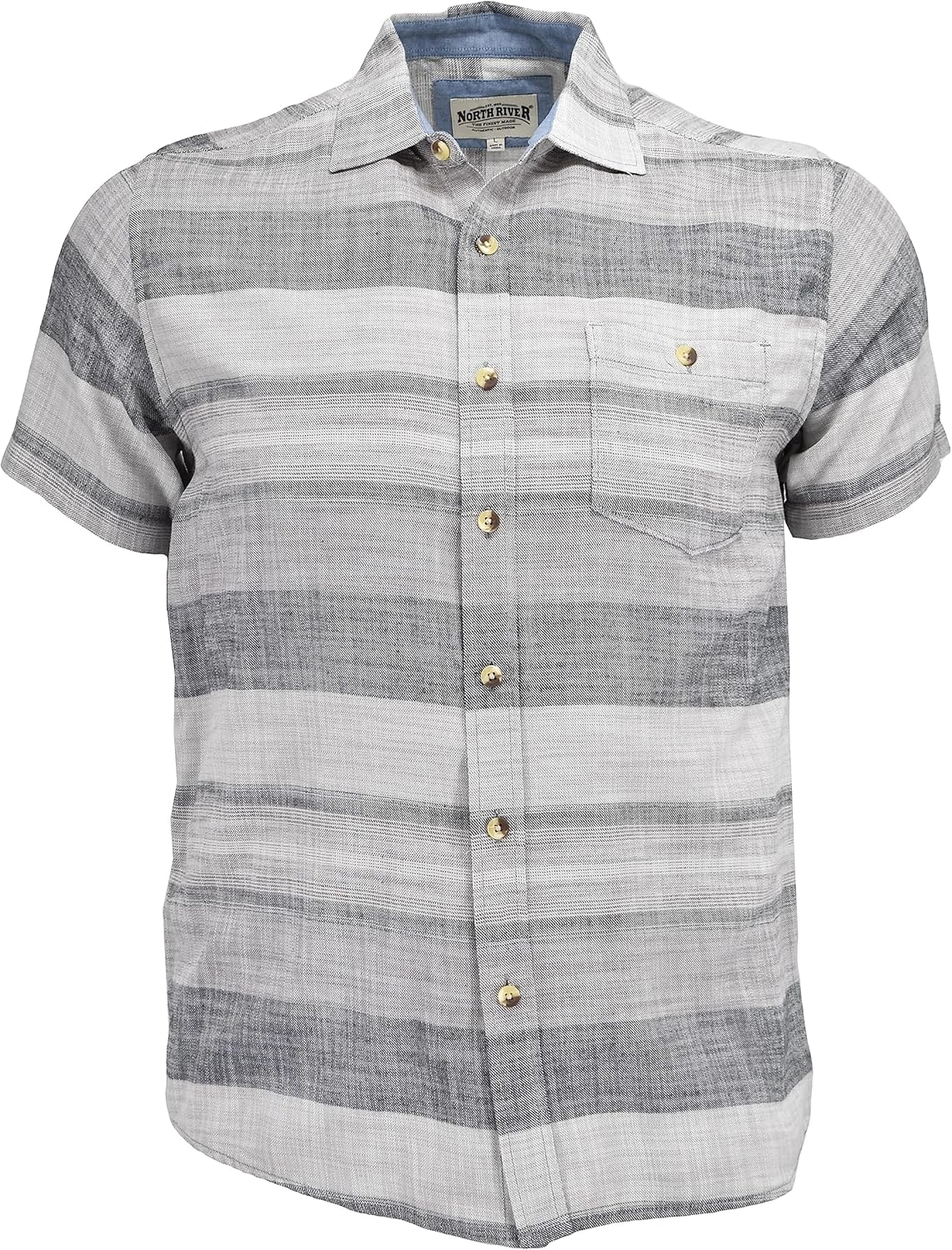 North River men's button down front horizontal crosshatch ombre stripe short sleeve sport shirt. 100% cotton. Button through patch pocket, placket front and a spread point collar.