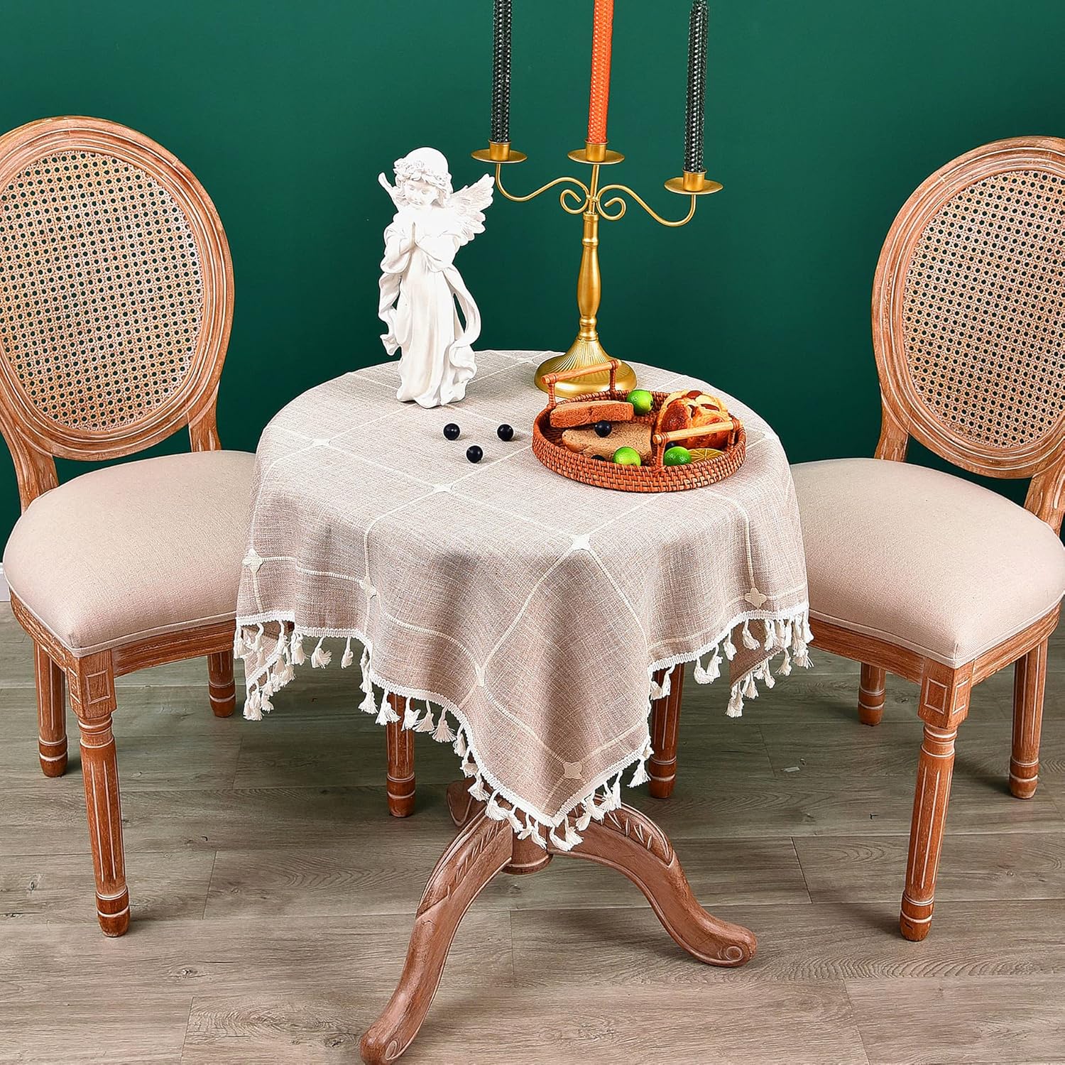 MATERIALS: The tablecloth is made from super, hard wearing cotton linen fabric, with a seamless construction that won't easily fray after long term use. SIZE: Available in a variety of sizes, fit for square, rectangle, round and oval table, fit for dinner table, coffee table, book desk, storage table, etc. DESIGN: Plaid embroidery pattern on cotton linen fabric with beautiful fringed edges, this elegant tablecloth will increase the charm of your table. VARIOUS OCCASIONS: This table cloth is perfect for home, dining room, party, holidays, catering, cafes, dinners, brunches, potlucks, BBQ's, buffets, baby showers, special occasions or everyday use. EASY TO CARE: Machine washable, wash in gentle cycle with like colors; do not bleach; Tumble dry low.
