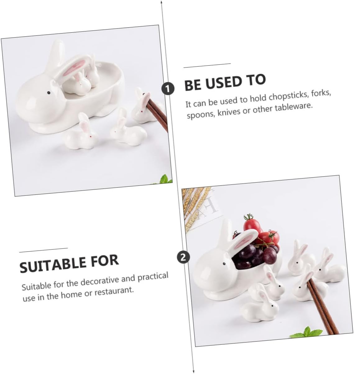 Package List 15 x chopstick racks 3 x tray Features - Size: 16.00X8.50X9.00cm/6.29X3.34X3.54in Kitchen Supply. - Color: white Japanese Chopstick Stand. - Material: ceramic Kitchen Tableware. - for holding chopsticks, knives, spoons, forks, spatulas and other utensils Creative Chopsticks Stand. - Adoption of ceramic material, sturdy and for long-term use Chopsticks Rack. - All items come with the smooth surface, making it convenient to clean Ceramic Chopsticks Rest. - With creative rabbit shaped design, the chopstick rack is pretty and add a good feeling when having a meal Ceramic Chopsticks Holder. - It features the creative modeling design, which will increase appetite Table Decor.Goods InformationChopsticks Stand It can be used to store your flatware, also can decorate your table, making your table pleasant and unique.Ceramic Chopsticks Rest The choice for you.Chopsticks Holder This item is a set of unique chopsticks rack tableware, adoption of and material.Table Decor for the use in the restaurant and home