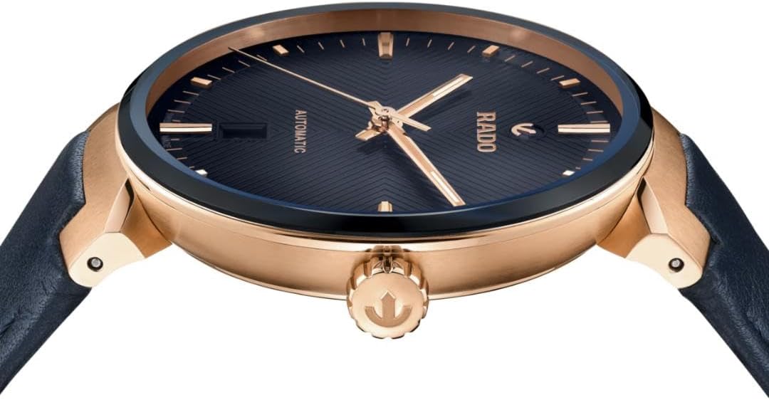 Discover the timeless blend of Swiss precision and elegance with the iconic Rado Florence. The 39 mm case is crowned with an edge-to-edge sapphire crystal, featuring a metallised edge that matches the rose gold colour of the case. This sapphire crystal functions both as the protective front and as a bezel, seamlessly integrated into the case to enhance the Florence iconic refined profile. Serving as a theatre scene, the silver white dial showcases extreme attention to detail with its sophisticated embossed pattern. The contrasting rose gold-coloured applied hour markers, topped by the moving Rado anchor symbol, finished with brushing and polishing, create a hypnotising contrast against the silver-white background. The case is complemented by a brown leather strap, perfectly proportioned to the end links, and secured by a rose gold PVD-coated stainless steel pin buckle. Beneath the box-shaped sapphire crystal case back lies the soul of the Florence: the Automatic R763 calibre. Finely regulated in five positions and featuring a Nivachron™ hairspring, this movement delivers a high level of accuracy and a robust 80-hour power reserve, underlining Rado's commitment to perfection.