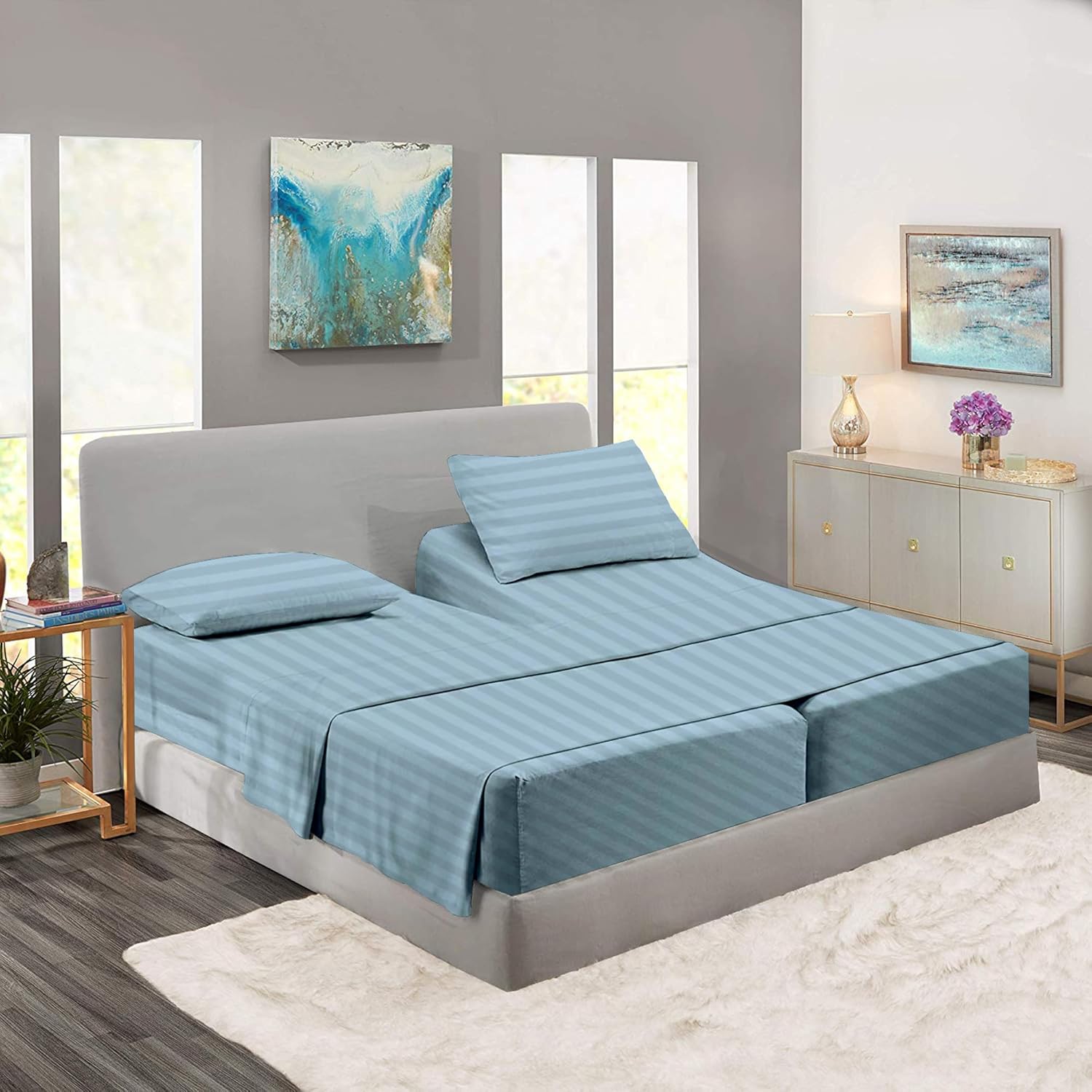 Rajlinen Split Queen Sheet Sets for Adjustable Beds - Sheets for Sleep Number Bed 15" Deep Pocket - 100% Cotton Split Queen Bed Sheet Set - Split Queen Sheets 5 Pcs - Sage Stripe