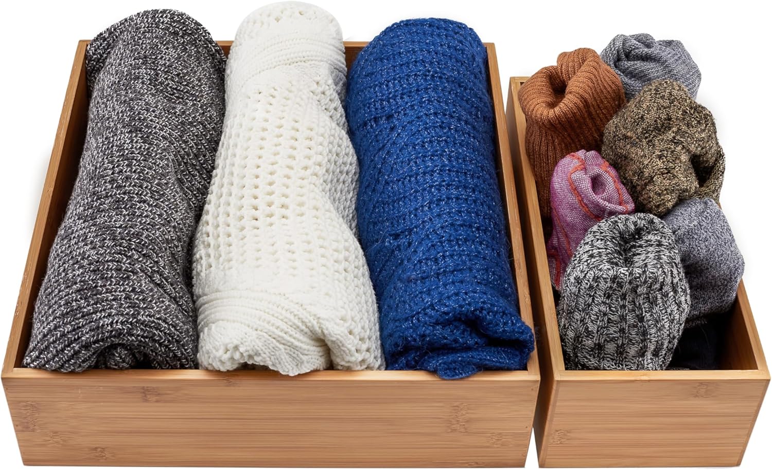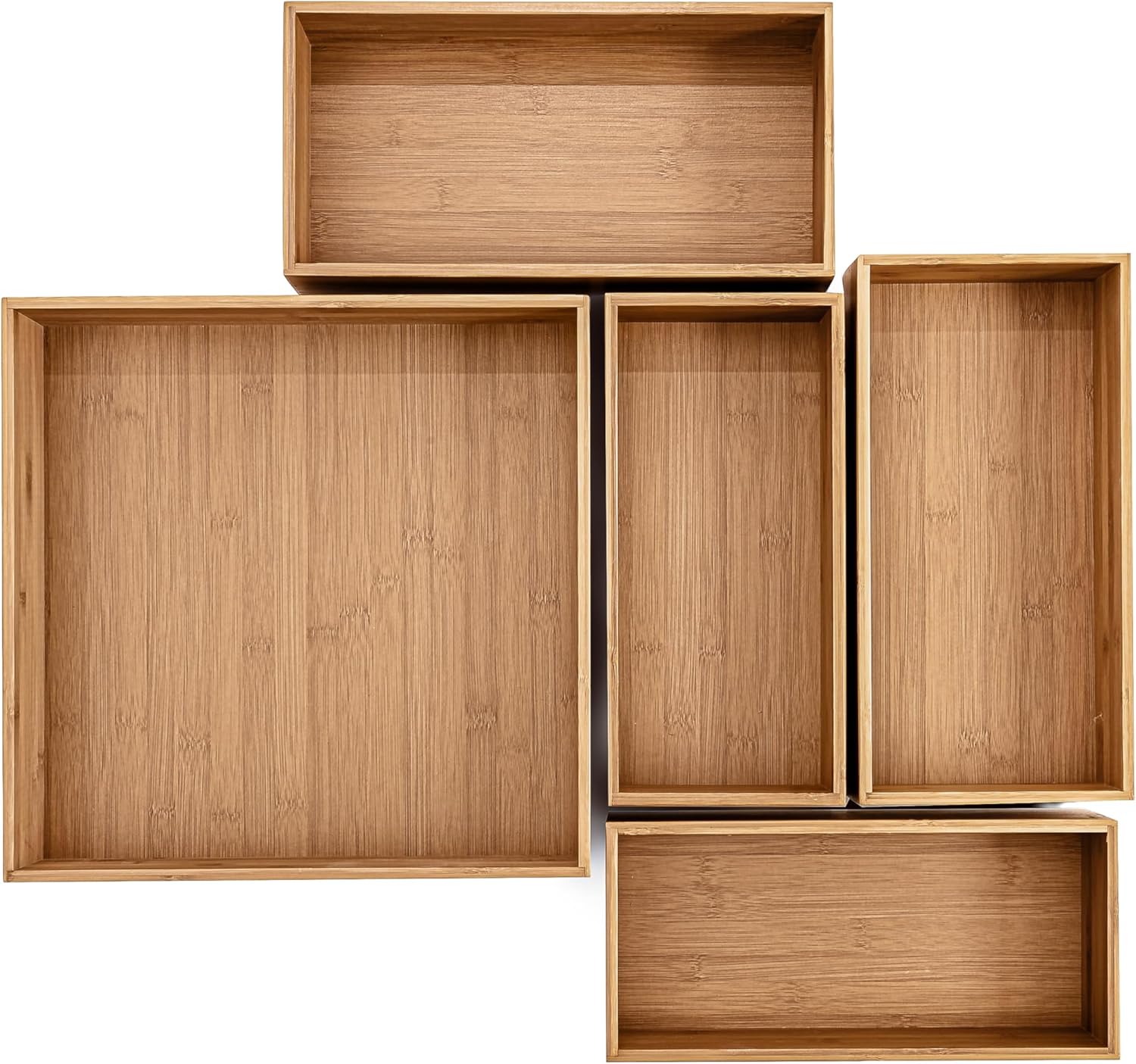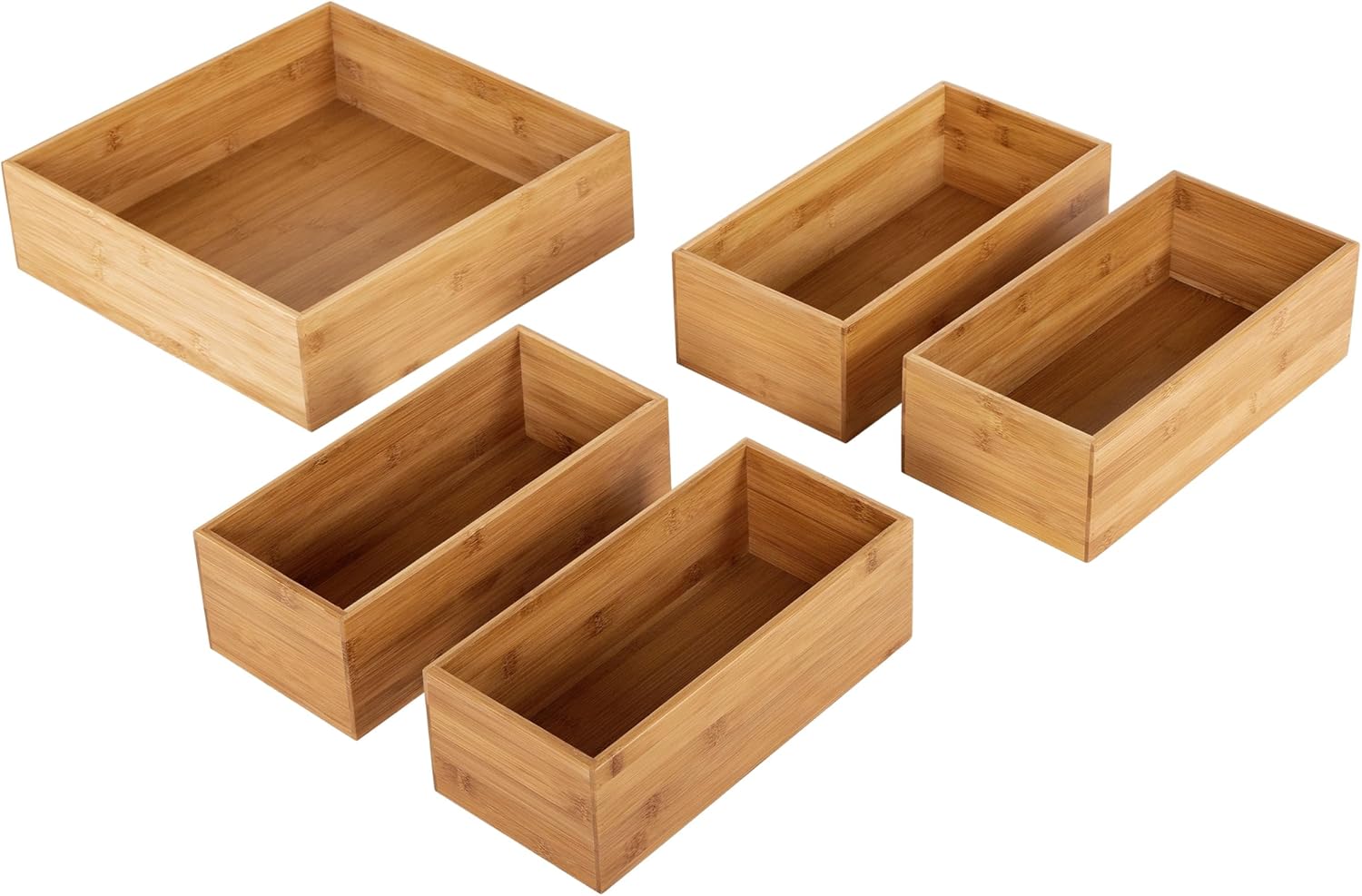 Declutter any area with Seville Classics’ 5-Piece Bamboo Organizer Bin Set, a sleek, functional design that adds a natural aesthetic to your space. Our set includes one large bin (14" W x 14" D x 4" H), two medium bins (13.2” W x 6.6" D x 4.4" H), and two small bins (12.25” W x 5.7” D x 4” H). The organizer’s walls are constructed from 100% bamboo, a sustainable and durable material. The bin bases are made of durable MDF with a bamboo-print veneer, combining style and strength. The open-top design provides easy access to your items. Ideal for organizing a range of items, including kitchen essentials, pantry staples, cosmetics, office supplies, and more. Our bamboo bins make tidying up feel like a breeze.