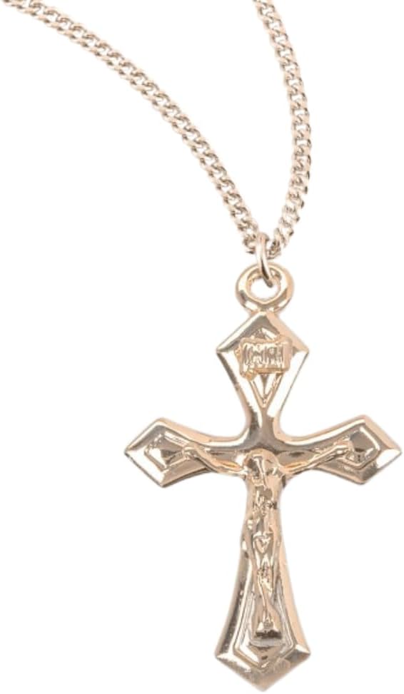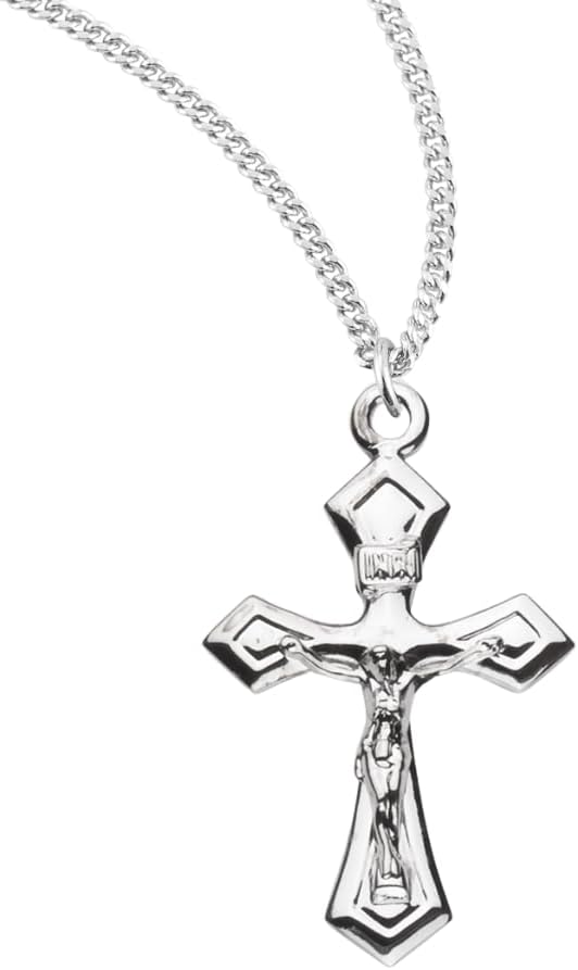 This Flower Tipped Sterling Silver Crucifix is a beautifully crafted piece that symbolizes divine love, faith, and protection. Made from solid .925 sterling silver, the pendant measures 1.0" x 0.6" (25mm x 14mm) and weighs 1.2 grams, providing a sleek yet elegant design perfect for daily wear. Expertly die-struck and hand polished by skilled artisans at New England Silversmiths, it ensures exceptional craftsmanship and intricate detailing. The pendant comes with an 18" genuine rhodium plated stainless steel chain and is presented in a deluxe velvet gift box, making it a thoughtful gift for religious milestones, special occasions, or as a cherished keepsake. Proudly made in the USA.