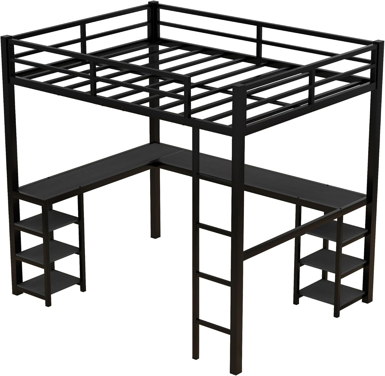 Transform your bedroom into a haven of efficiency and style with our Space-Saving Full Metal Loft Bed. This innovative solution expertly combines a secure, elevated sleeping platform with a fully functional workspace and ample storage beneath, making it the ultimate choice for maximizing limited square footage. Experience the ingenuity of the L-Shaped Loft Bed design. By fitting snugly into a corner, this full bed creates a highly efficient footprint. The expansive area below the elevated bed frame is liberated, ready to be transformed into your ideal home office, study sanctuary, or personalized display zone. The integrated desk forms a practical L-shape, perfect for supporting computers, books, and essential items. Adjacent shelves provide organized storage for books, décor, or daily essentials, keeping your space tidy. Safety and durability are paramount. Our full metal loft bed features a sturdy iron frame engineered for exceptional strength and long-term reliability. High-quality materials resist rust and chipping, ensuring the bed retains its sleek black appearance. Rest assured on the upper level, protected by full-length guardrails on all sides. Access is safe and convenient via the integrated stairs-style ladder, a hallmark of secure bunk bed with stairs design. Supported by heavy-duty steel legs, this full size loft bed with desk offers a robust 350lb weight capacity for the sleeping area. Enjoy seamless setup with our comprehensive assembly guide and included hardware. The result is a versatile full size bunk bed with desk that transcends ordinary furniture. It's more than just a bed frame; it's a complete space-saving ecosystem, merging comfortable sleeping quarters with essential living and working areas.
