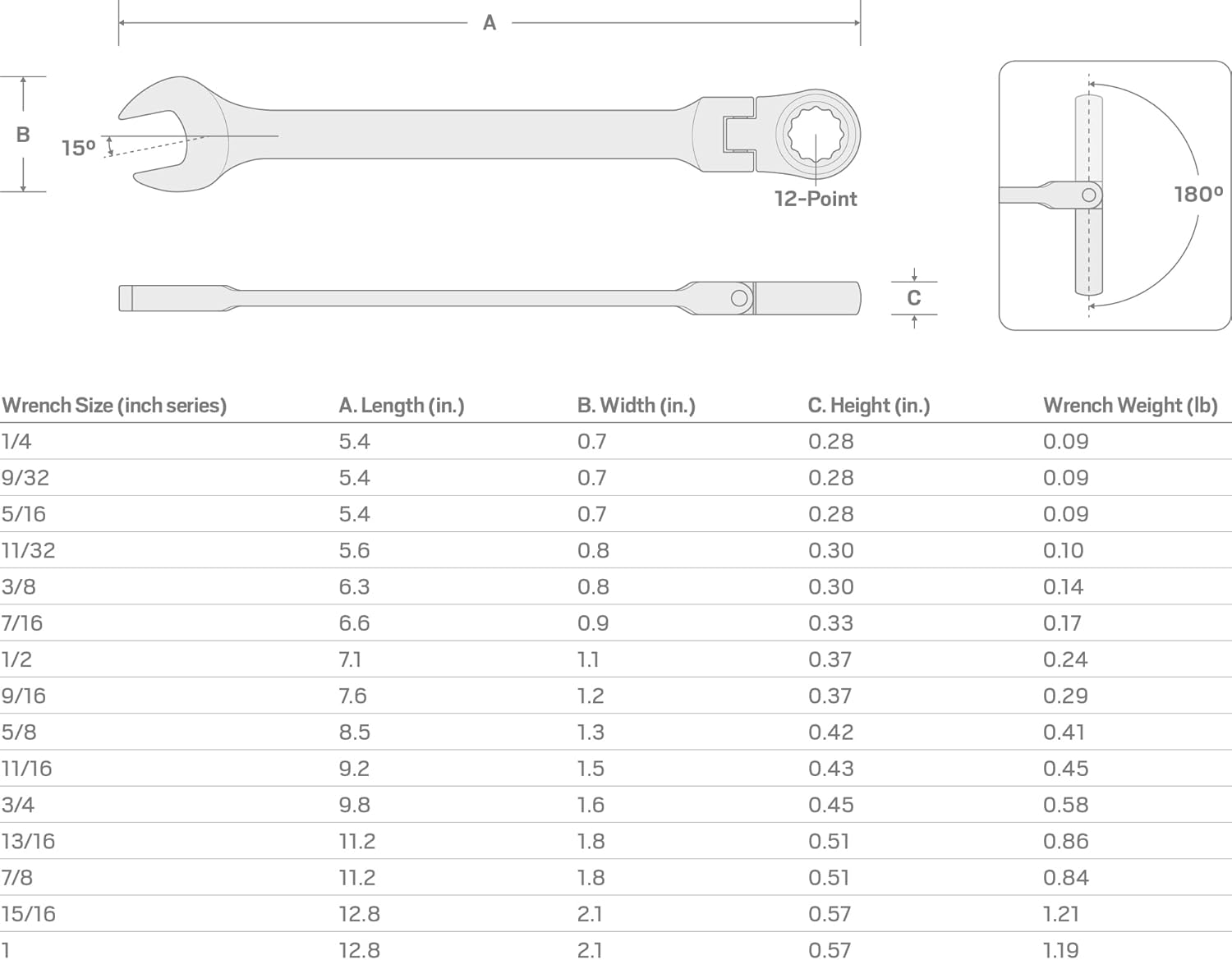 | Included Components | (1) TEKTON 15/16 Inch Flex Head 12-Point Ratcheting Combination Wrench | WRC26324 |