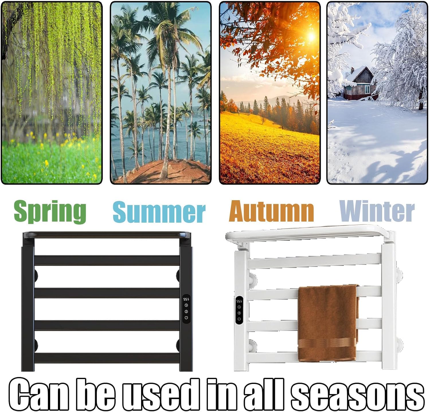 Product name: Smart electric heated towel rack, home, bathroom, toilet, towel bar, electric heating constant temperature bath towel drying rackColor: black/whiteMaterial: aluminum alloyFunction: digital display of temperature and time, touch temperature adjustment, timed shutdownTiming method: touch digital tube to shut down timing (1~9 hours)Temperature: 30-70℃/86-158°FInstallation method: punching/punching-freePower supply method: plug-inPower cord length: 1.5 m spring wireScope of application: bathroom, kitchen, balcony, toilet, swimming pool, hotel and other places, simple design, multi-functional usePackage content:1* towel heater1 * installation accessoriesNotes:1.Due to manual measurement, the size error is 1-3cm. Errors may occur, please refer to the actual product.2.Due to shooting and environmental reasons, the color is subject to the actual product.