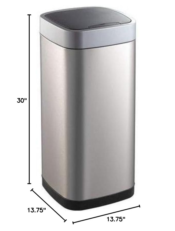 'Trash Can, Indoor, Receptacle Container Style Utility, Container Mounting Style Free-Standing, Container Shape Square, Trash Container Capacity 21 gal., Primary Container Color Silver, Height 30-23/32 In., Trash Can Dia./Width 13-3/4 In., Opening Closure Type Sensored, Container Depth 13-3/4 In., Series EcoSmart Sensor Bin, Basic Container Material Plastic, Specific Container Material ABS, Stainless Steel, Top Design Flat Top, Container Strength Light Duty, Finish Matte, Lid Options Lid Included'
