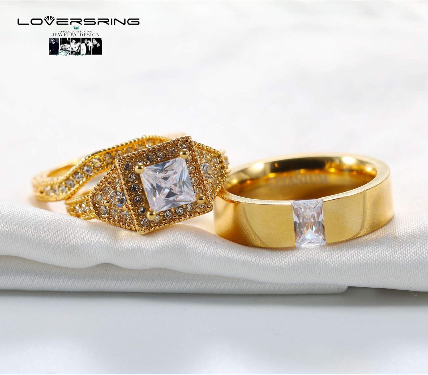 About the size measure Measure your finger size before purchase, for couple ring can not be resized. The paper measurement is intended for reference only. We would like to suggest you have your finger sized at a jewelry store for an accurate ring size. Women's Bridal Wedding Rings Sets This classic ring set is made of Non-Tarnishing Yellow Gold Plated. It will not fade, change color, or leave stains on your finger. The high graded Cubic Zirconia will never lose their brilliance or color. The center-set white CZ stone . This attractively designed of this novelty bridal set rings has the traditional engagement ring and wedding ring, if one chooses to do so the rings can be worn individually. Men's Titanium Matching Band Men's 8 mm wide comfort fit wedding band. Interior of band is slightly rounded to provide a comfortable fit for daily wear. It is made of non-tarnish, high quality Titanium . Titanium jewelry is durable, and hypo-allergenic (nickel-free). 30-Day Money Back Guarantee If you are not satisfied with an item that you have purchased, you may return the item within 30 days from the order date for a full refund of the purchase price, minus the shipping fee.
