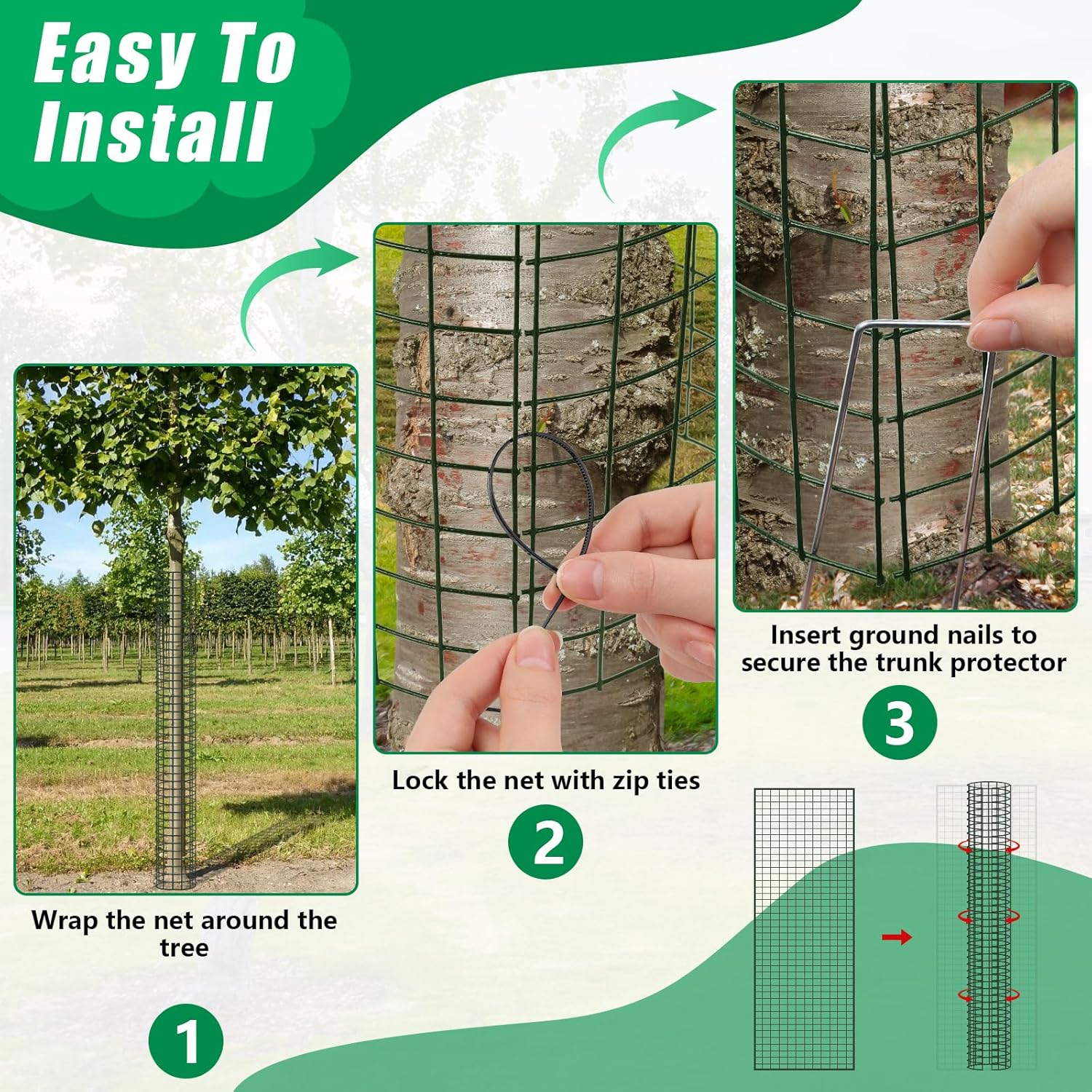 12 PCS Tree Guards Trunk Protectors--Size: 4.5 inches in diameter, 48 inches in height--Durable and reusable--Suitable for all trees, multiple pieces can be flexibly combined according to trunk thickness and height--Mesh structure, smooth air circulation, ensuring that plants have enough sunlight and moisture, and will not accumulate moisture and breed bacteria--Package includes: 12* metal plant protection mesh, 24* ground nails, 1 pair of gloves, and 200* cable ties