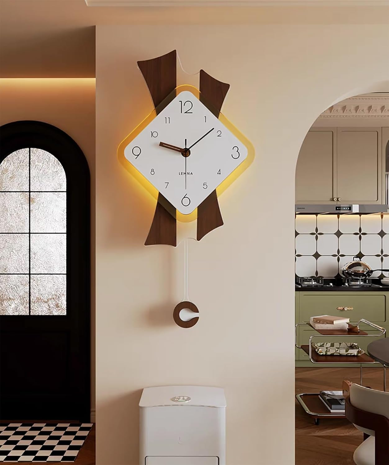 Add a touch of modern elegance to your living space with our exquisite Iron Pendulum Wall ClockCrafted from high-quality acrylic and wood material, this decorative piece features a metal pointer and operates silently, making it perfect for the bedroom, dining room, office, or entrywayAvailable in two sizes - 11.8*24.4 in (30*62 cm); 13.8*28.3 in (35*28.3 cm) - this battery-operated clock will enhance any room's aestheticThe unique design and non-ticking movement make it a stylish addition to your home decorBattery-operated for convenience and easy setup, this decorative wall clock adds a touch of sophistication to any roomUpgrade your space with this beautiful wall clock today● Product Description: Name: Modern wall clockCraft: HandmadeMaterials: Acrylic, wood, metalMovement: Silent movementScope of application: The wall of Living room, entryway, bedroom, dining room, officePackage includes: Wall clock*1● Precaution: Carbon battery is recommendedPlease check whether the clectrodes are correct before installing the battery