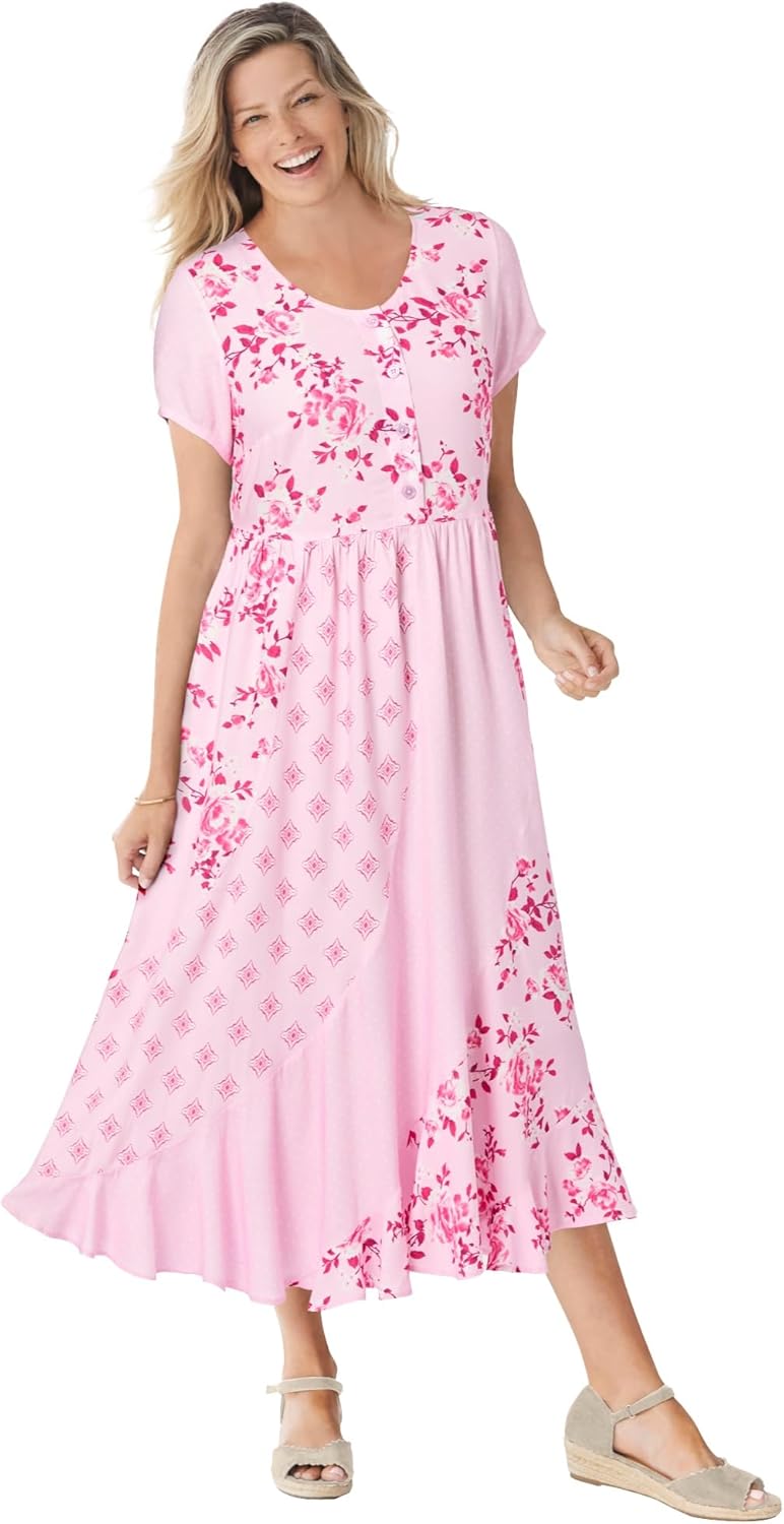 br>Embrace effortless style with our Mixed Print Maxi Dress featuring a bold allover print. br> The flowing silhouette and slight empire waist flatter your figure, making you feel beautiful. br> Perfect for layering – pair it with a cardigan or denim jacket for a versatile, year-round look. br> Available in two lengths: Average length of 48" and Petite length of 46". br> Made from lightweight, breathable rayon for all-day comfort and softness. br> Easy care – simply machine wash and wear. br> Imported.