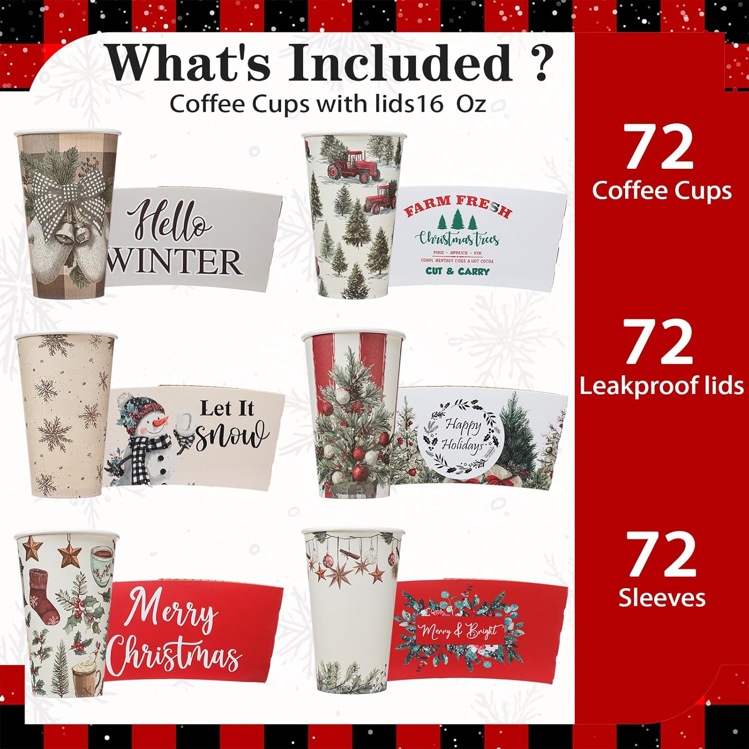 | Included Components | 72 x Christmas tree coffee cups, 72 x Cup lids, 72 x Cup sleeves |