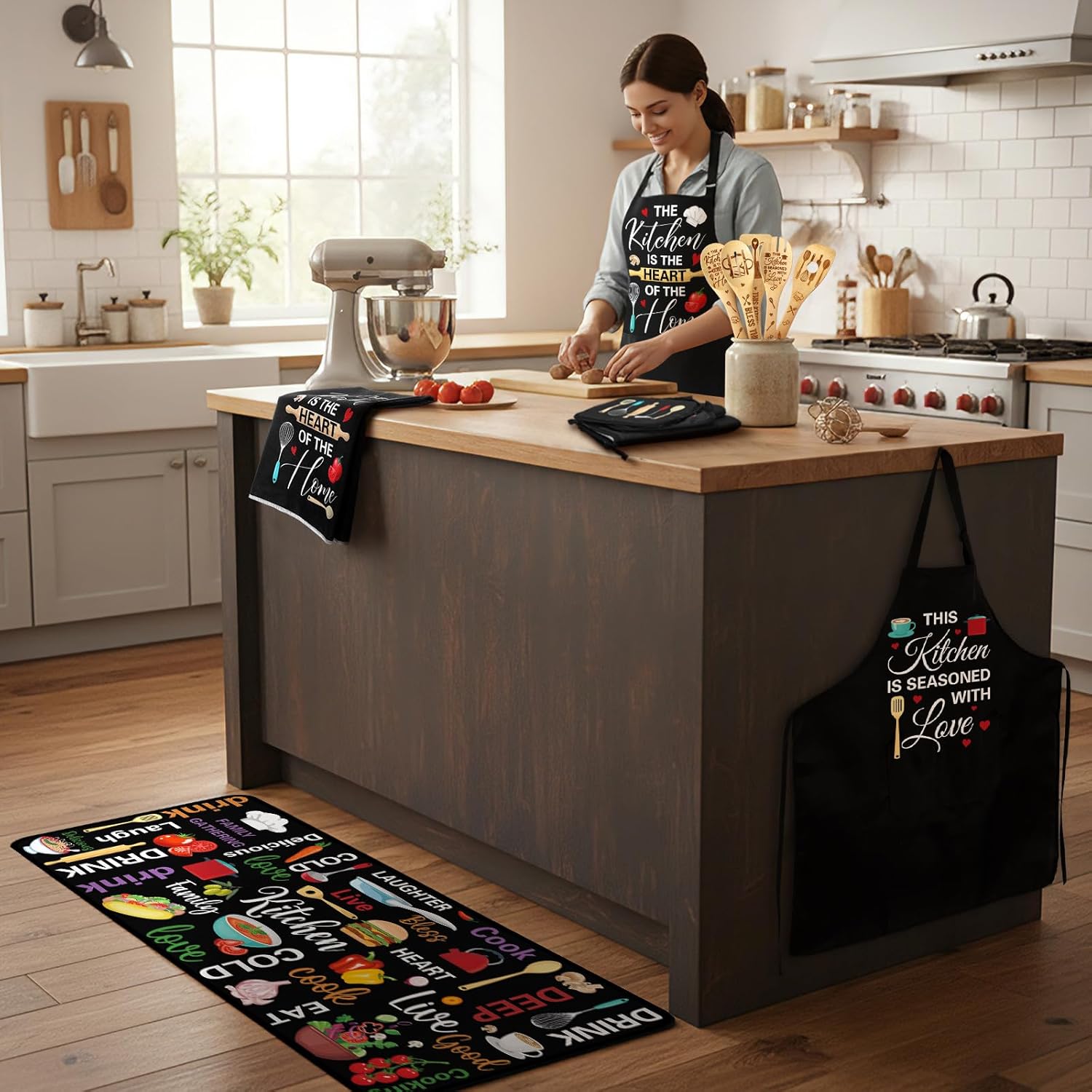 Features: Vibrant kitchen food theme Theme: This kitchen set not only provides functionality but also cheerfulness with its vibrant kitchen food pattern design. This fetching combination of black kitchen themed kitchen accessories for cooking, kitchen towels, and aprons, adds a joyful buzz to your kitchen decorations, ensuring a lively cooking space Housewarming Gift: Our farmhouse themed kitchen accessories are perfect for decorating your kitchen and also suitable as a house gift for cooking lovers Specifications: Material: Wooden spoons: wood Kitchen towels: polyester Kitchen aprons: nylon Pot Holders and Oven Mitts: polyester Kitchen rug and mat: polyester Color: please refer to the picture Size: please refer to the picture Package includes: 4 x Kitchen towels 5 x Wooden spoons 2 x Kitchen aprons 2 x Oven mitts 2 x Pot holders 2 x Kitchen rugs Notes: Manual measurement, please allow slight errors on size. The color may exist a slight difference due to different screen displays. Please double check the size carefully before buying