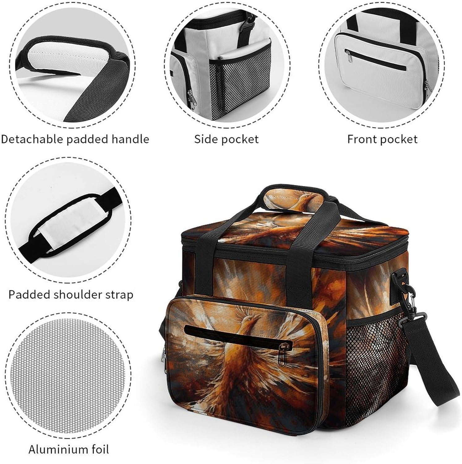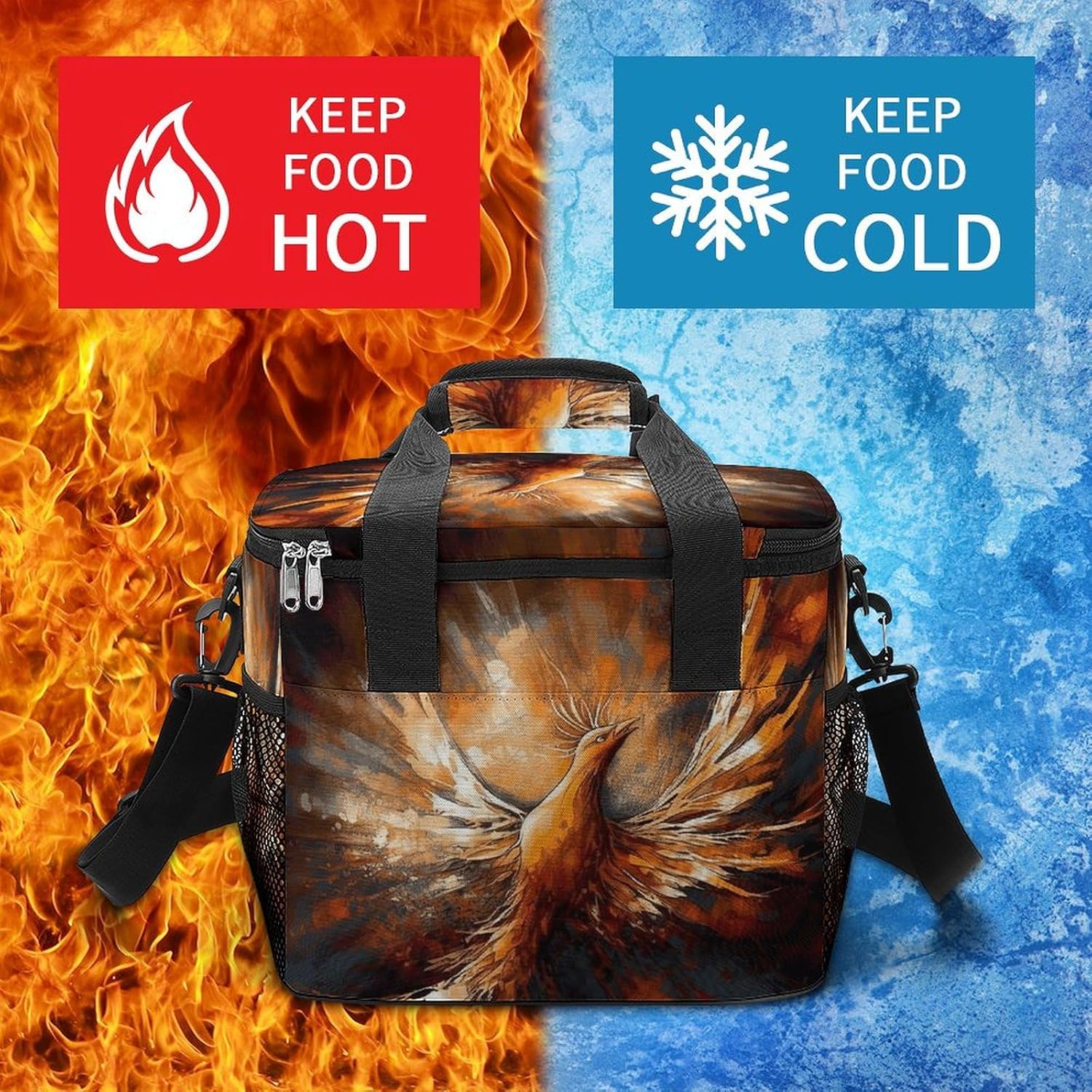 Versatile design: The Abstract Phoenix print travel cooler bag stylish, gender-neutral design is suitable for all ages and occasions, whether for work, gym, outdoor events, or travel.Perfect for every occasion: This insulated food bag is not just for camping, rugged cooler bag is an excellent choice for everyday use, such as meal prep, lunch at work, grocery shopping, and more.Space-Saving design: The stand-up structure of the outdoor lifestyle bag saves space and makes it easy to store when not in use, insulated grocery bag perfect for compact packing.Machine washable: The reusable lunch bag is easy to maintain, food organizer bag is washable, but avoid prolonged soaking or bleaching to preserve its quality.