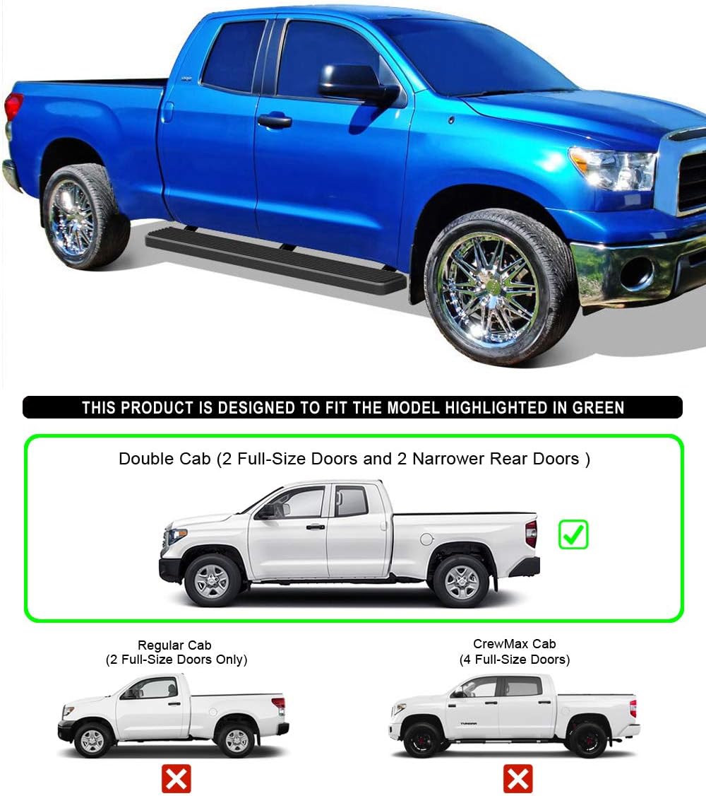 FitmentsCompatible with Toyota Tundra 2007-2021 Extended CabIntroductioneBoard running boards fit good and look good on your truck. These custom fit running boards have a simple, clean design that put bulky and over styled nerf bars to shame. The eBoard's lightweight yet durable aluminum frame supports up to 500 lbs without bending. Having full length and non-slip tread, these running boards offer safe footing and superior access to your vehicle. Crew Cab, Double Cab, Standard Cab, or Extended Cab - we have got you covered. Double check the compatibility of this item with your truck by clicking the see all vehicles this product fits link. Available in 3, 4, 5, 6 inch and a black powder coated or polished aluminum finish, eBoard running boards will outfit your truck in style.SpecificationMaterial: Extruded AluminumFinish: Black Powder CoatedStyle: Flat profile and straight - Full length step padInstallation: No drilling required, bracket custom mountItem Offered2pcs Aluminum Running BoardsAll Necessary Mounting HardwaresInstallation Instruction