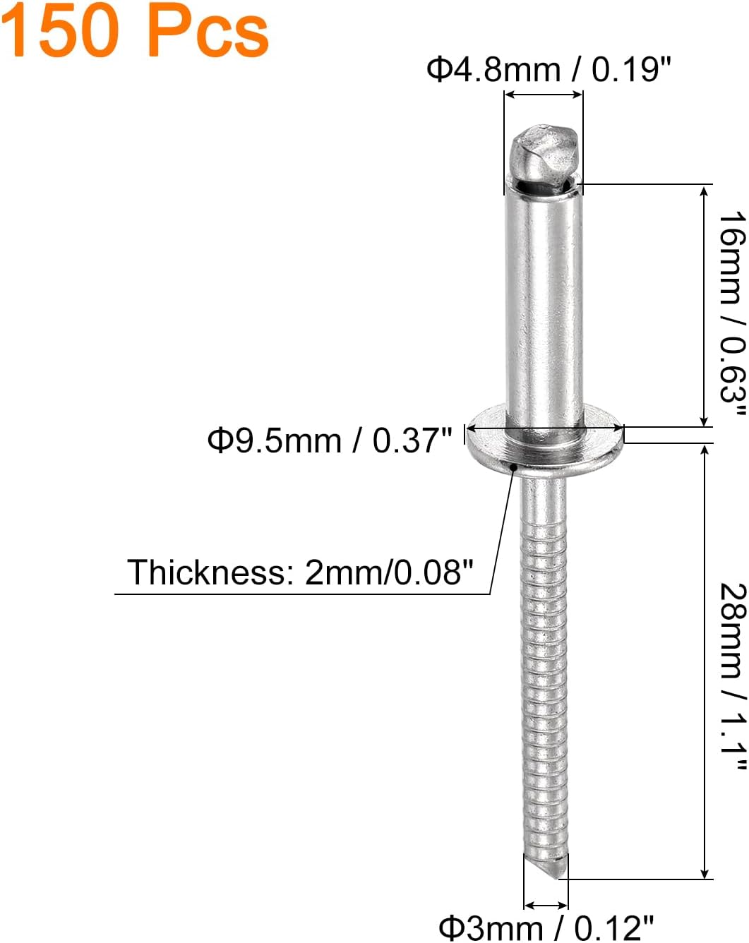 Description:Material - The dome-head blind rivets are made of 304 stainless steel with a smooth surface, strong, acid-resistant, and corrosion-resistant. There is no need to worry about rust or breakage; they are suitable for long-term use.Design - The rivet adopts an open round head design with a smooth and beautiful surface, which can adapt to materials of different thicknesses. It can also ensure that the rivet head contacts the surface of the connected material smoothly.Easy to Use - When installing open-head rivets, first choose the right rivet size for the material thickness and punch a hole through the materials. Then, use a rivet gun to flatten the open end of the rivet, securing the materials firmly together.Widely Applicable - The dome-head blind rivets are suitable for indoor and outdoor use. Suitable for a variety of materials, including metals, plastics, composite materials, etc. Widely used in furniture, pipelines, instruments, aviation, etc.Specification:Material: 304 stainless steelRivet body diameter: 4.8mm/0.19"Rivet body length: 16mm/0.63"Cap diameter: 9.5mm/0.37"Cap thickness: 2mm/0.08"Rivet diameter: 3mm/0.12"Rivet length: 28mm/1.1"Riveting range: 0.31"-0.48";Packaging: 150Pcs x dome-head blind rivets